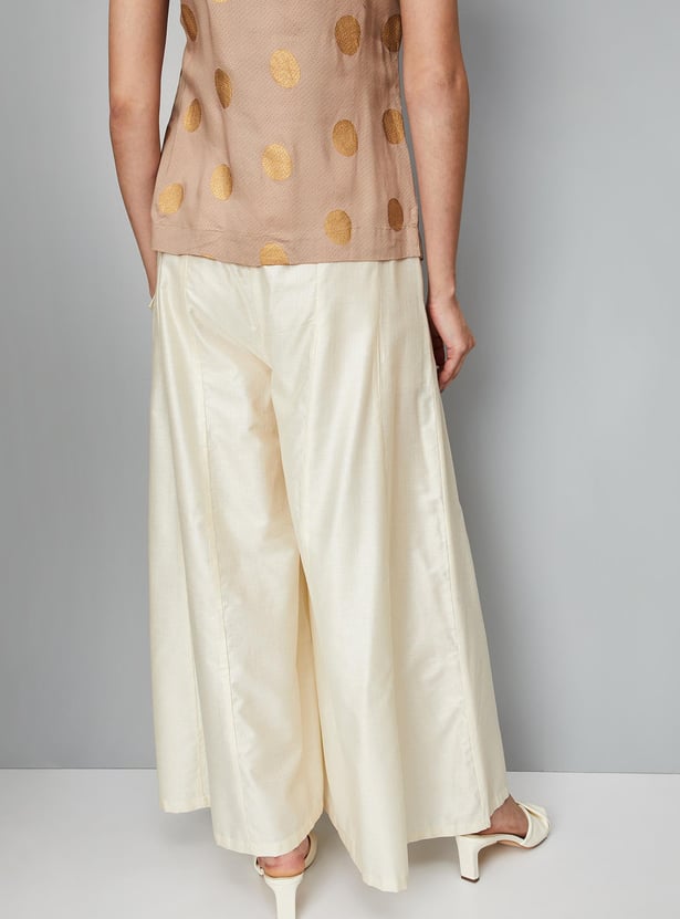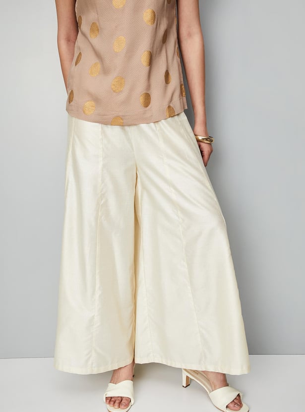 Let your ethnic ensemble stand out with this pair of palazzos. It is designed with a solid surface, elasticated waistline with drawstring closure, and full-length construction. Team it up with a pair of heels and a top to complete the look.