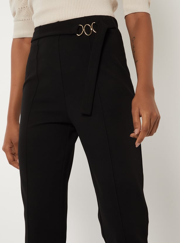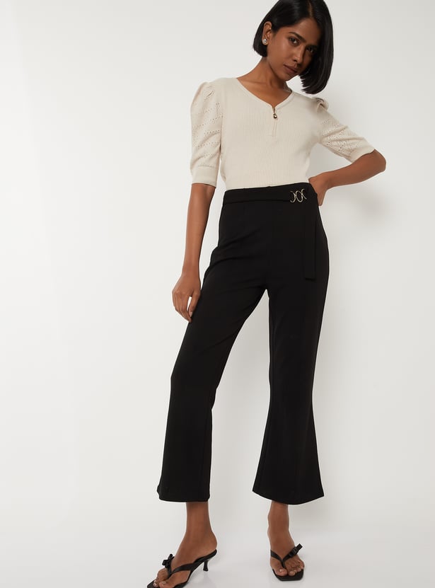 Step out in chic comfort with these solid flared crop trousers — a versatile wardrobe essential. Designed with an elasticated waist for ease and finished with a sleek metal accent, they bring effortless style to any look.