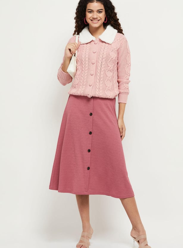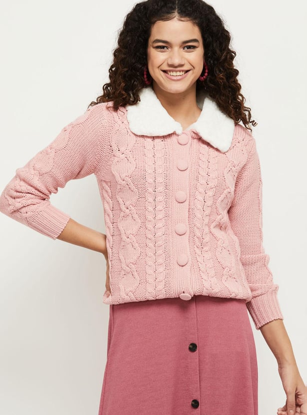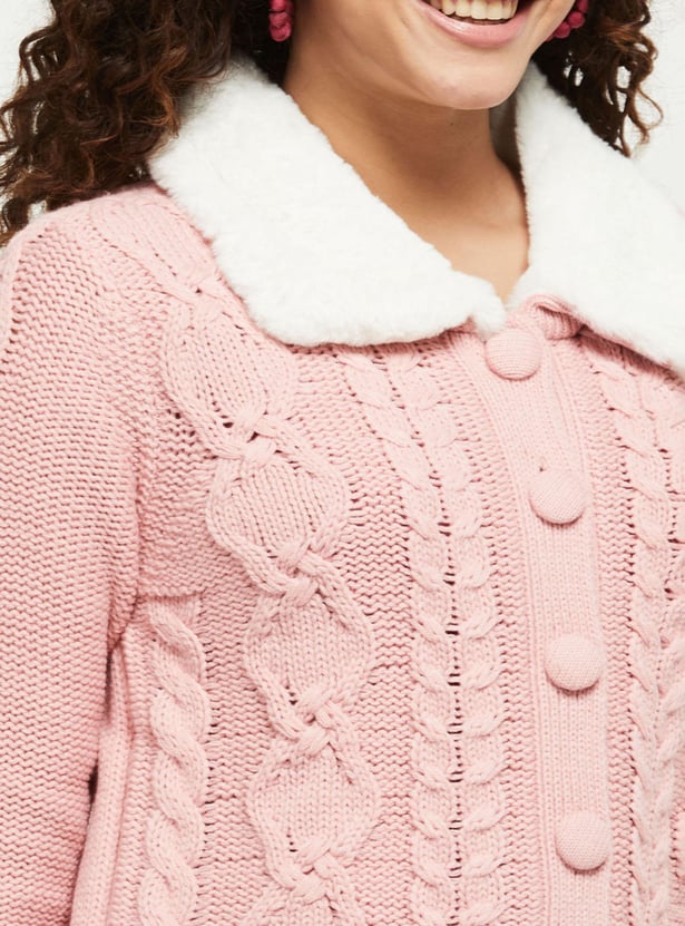 Keep yourself cozy and warm this winter with this sweater which has a fur collared V-neck, button closure, and long sleeves. Style it with a solid top and a pair of jeans for a stylish yet dapper look.