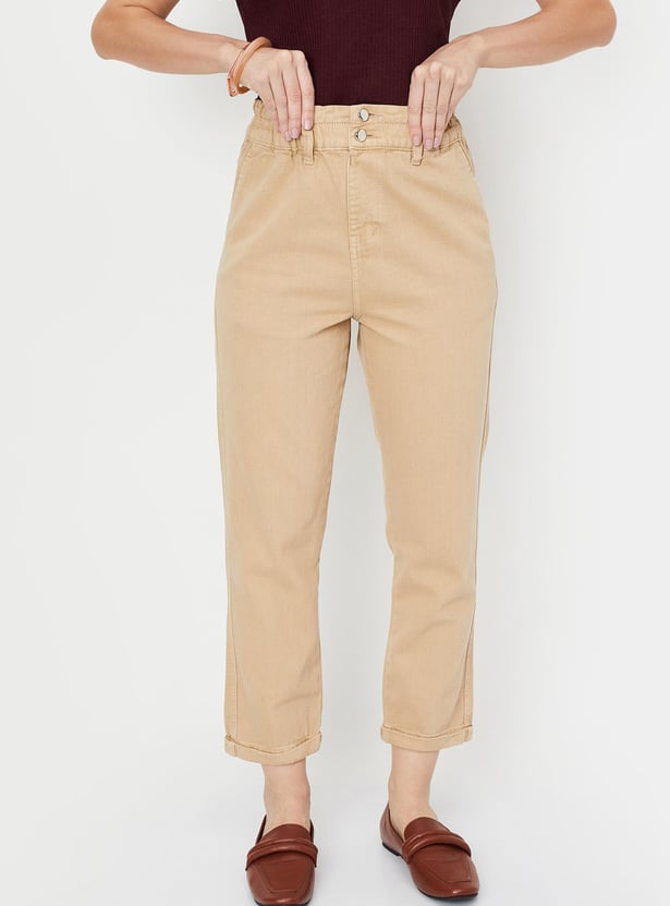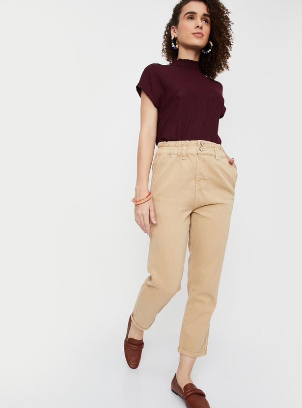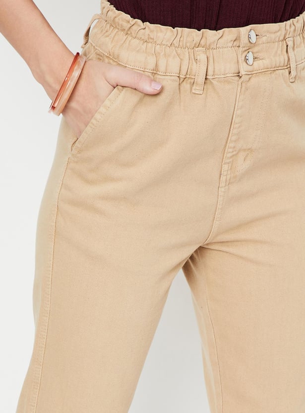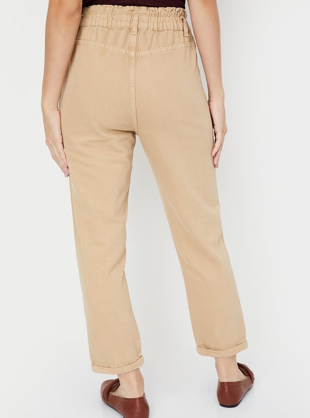 Slay your casual style with this pair of jeans features a paper bag waist with belt loops, insert pockets, and a full-length profile. Pair it with a solid cropped t-shirt and sneakers for a chic look.