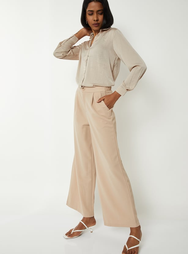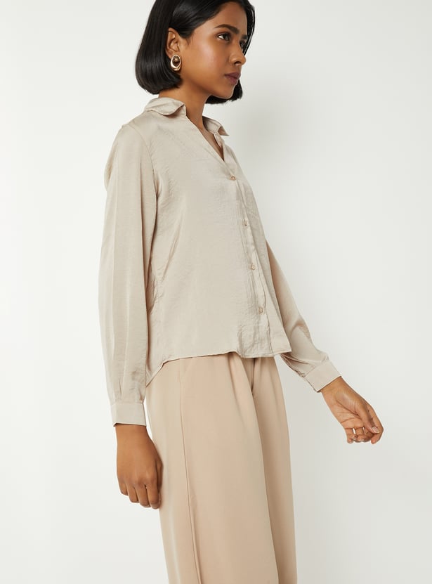 Step out in sleek style with this solid satin finish shirt. Featuring a collared neckline, button placket, and full sleeves, it adds a touch of sophistication to your look.
