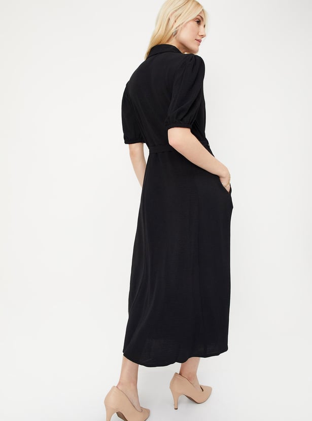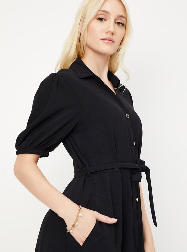 Stand out at any casual event in this stunning shirt dress. With its solid surface, spread collar, puffed sleeves, tie-up waist belt, and button-down closure, it's certain to make a statement.