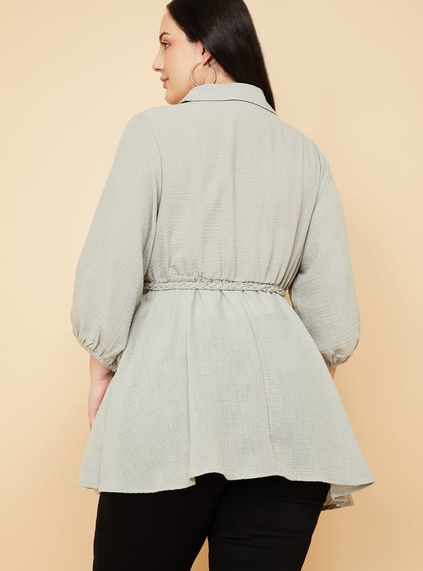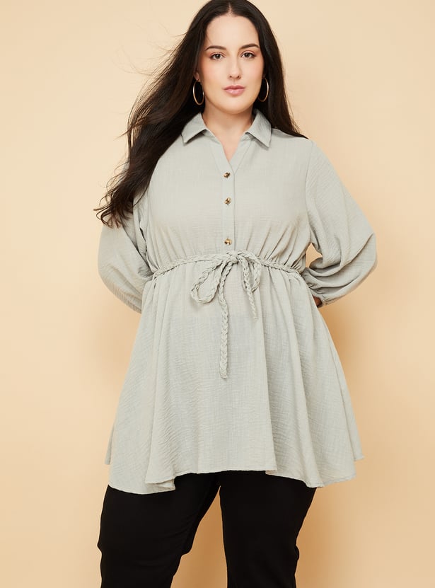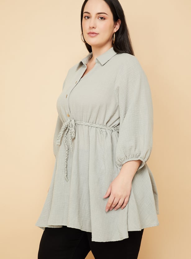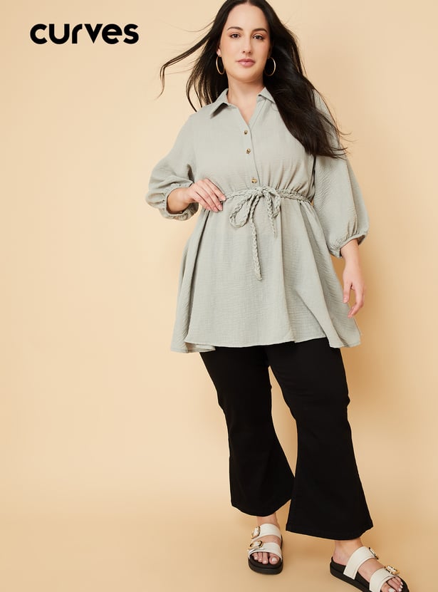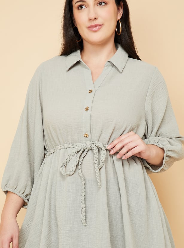 This solid shirt dress features a stylish mini length with a spread collar and a button-down bodice for a polished look. The 3/4th gathered sleeves with elasticated openings add a soft, feminine touch, while the braided belt cinches the waist to enhance the flattering A-line silhouette. Model Size