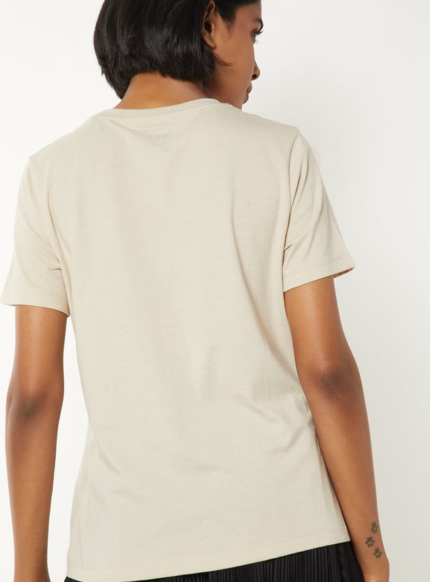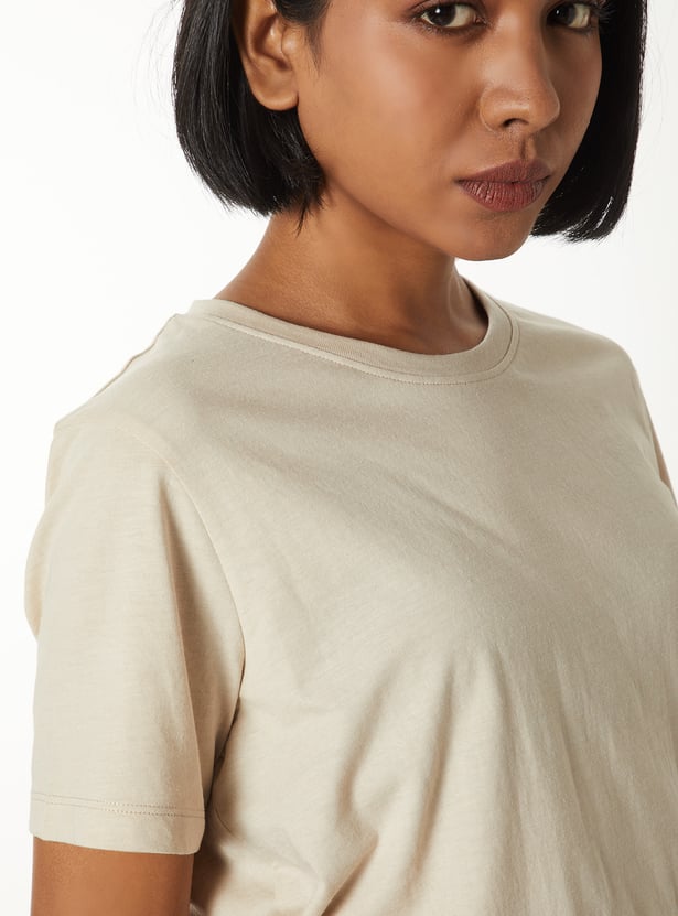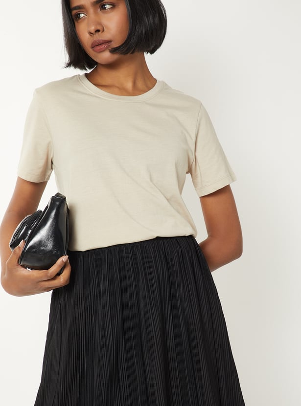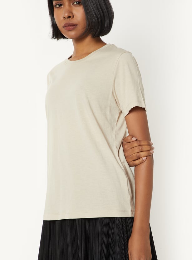 Refresh your everyday wardrobe with this timeless solid T-shirt, designed for comfort and effortless style. Featuring a classic round neck and half sleeves. Model Size :
