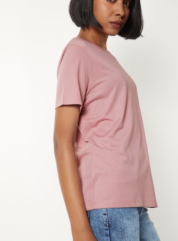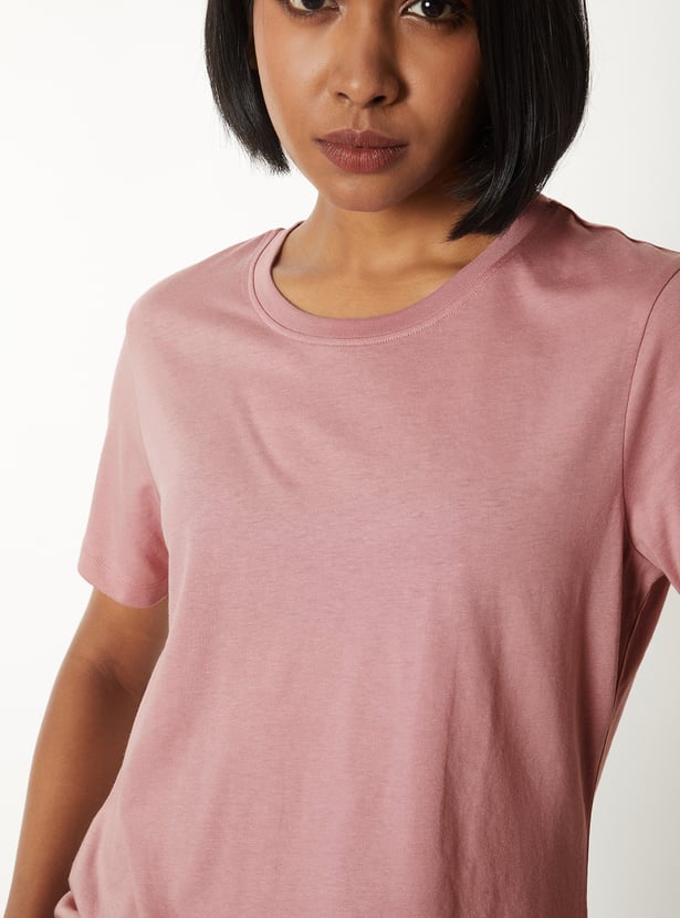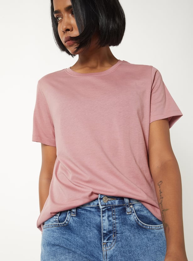 Refresh your everyday wardrobe with this timeless solid T-shirt, designed for comfort and effortless style. Featuring a classic round neck and half sleeves. Model Size :