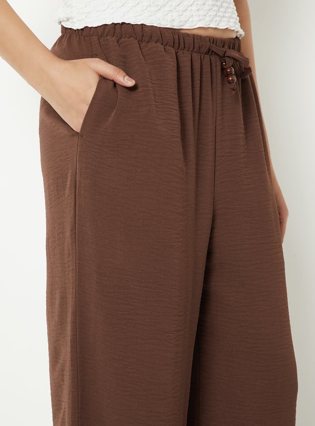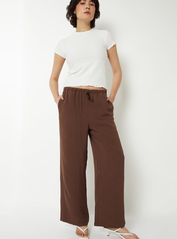 These solid full-length wide-leg trousers feature a relaxed silhouette with a drawstring closure for an adjustable fit. Designed with two convenient side pockets, they combine everyday comfort with effortless style.