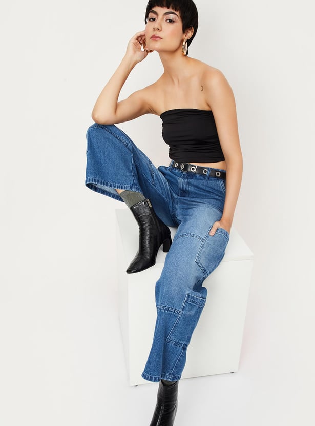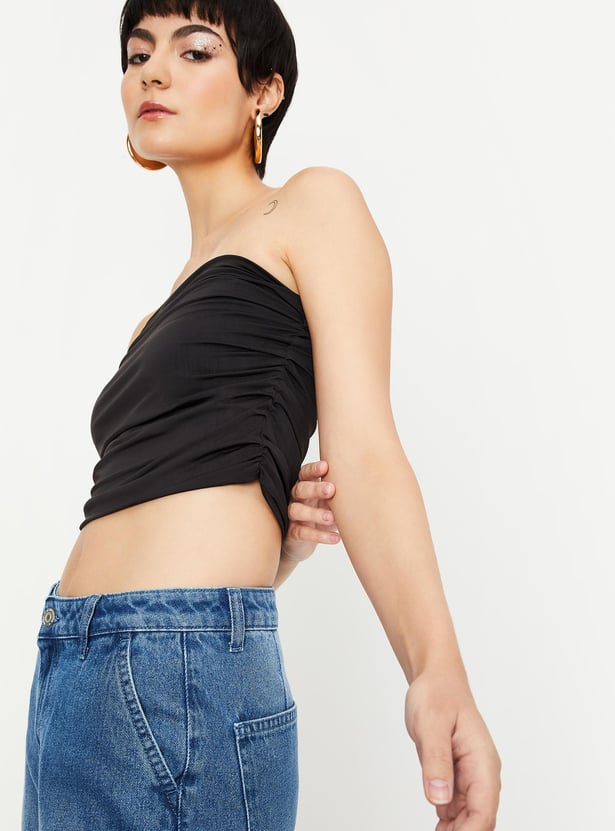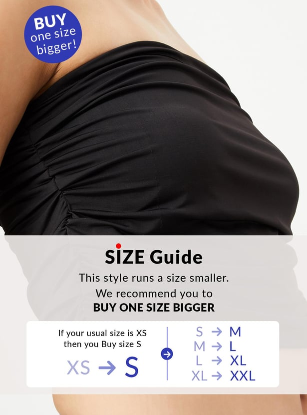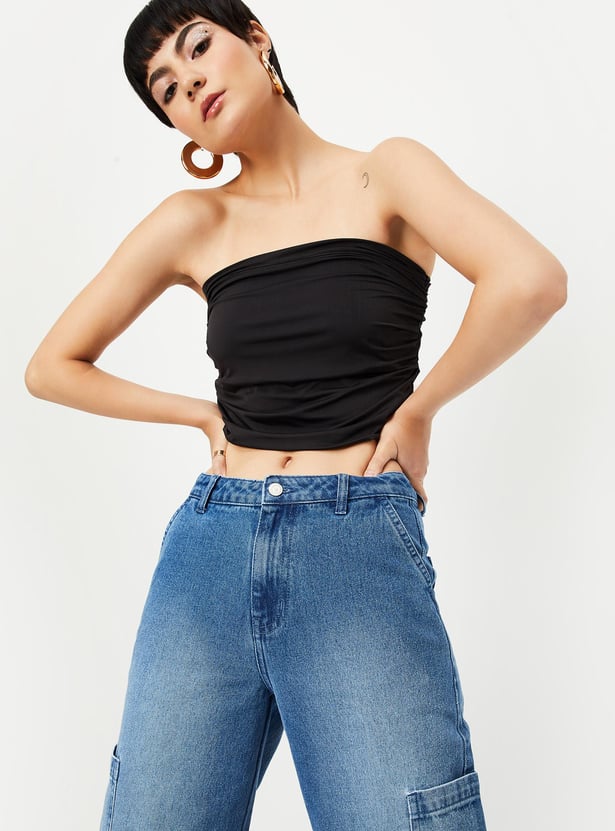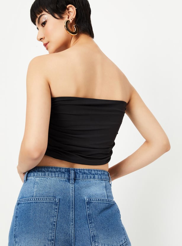 An ideal pick for any occasion, this tube top is designed with a solid surface and ruched effect on the sides making it a perfect ensemble. Style it with wide-leg jeans and boots for a trendy look.