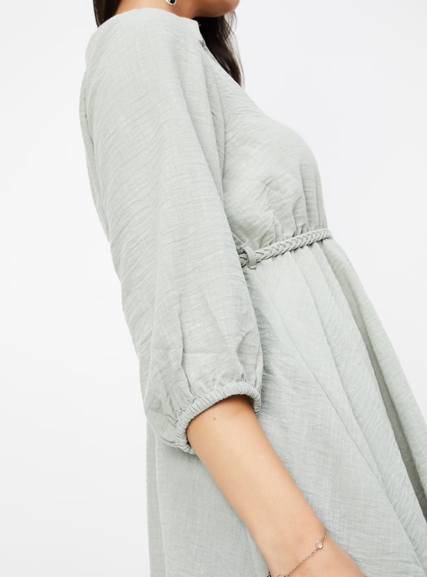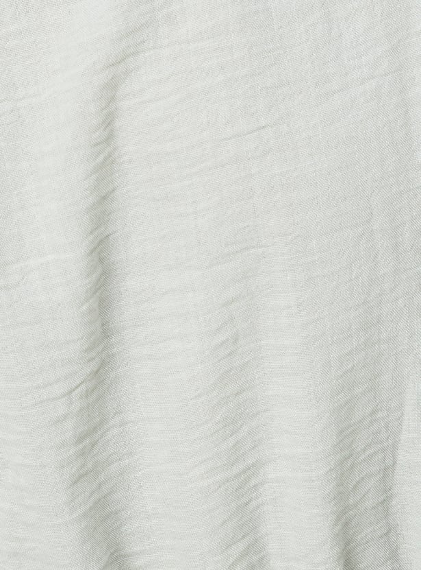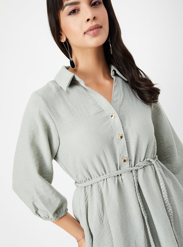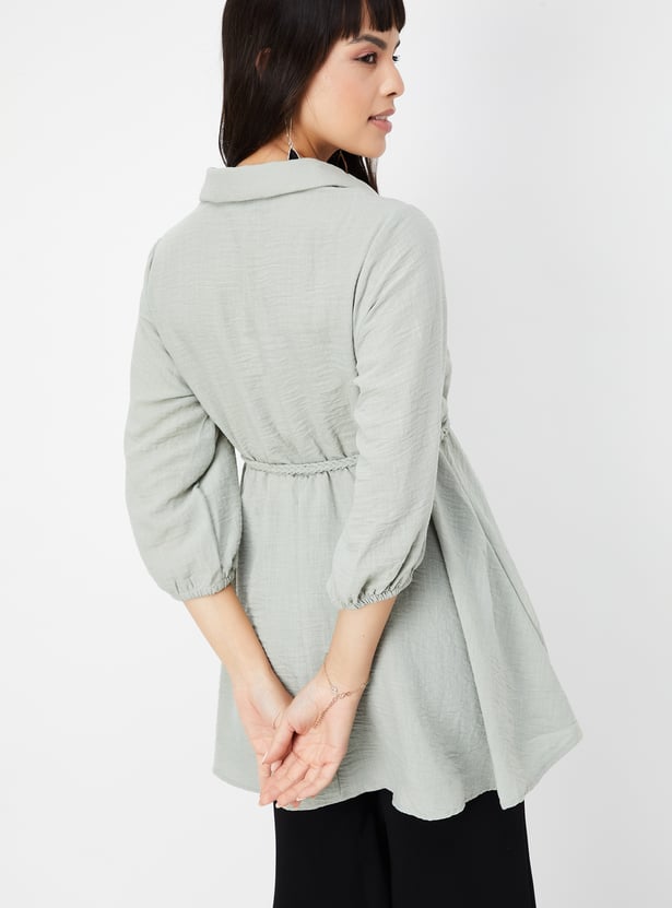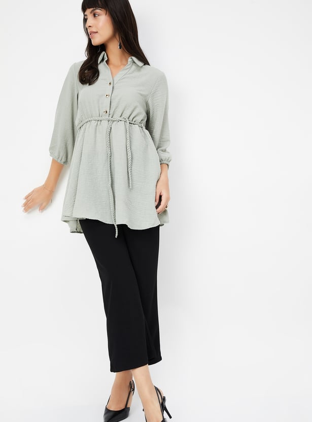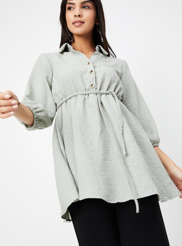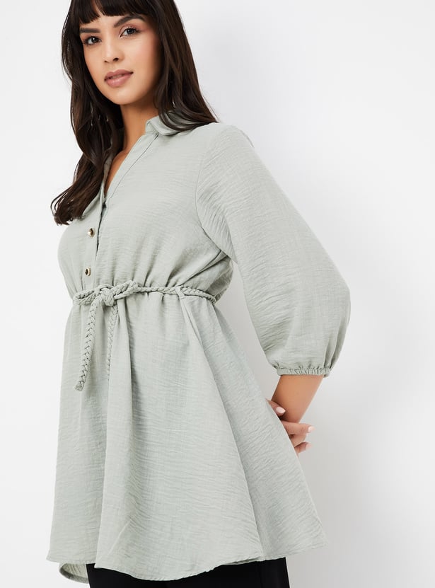 Seize the day with this solid tunic, featuring a spread collar, three-quarter sleeves, and a stylish tie-up detail. The button placket adds a touch of sophistication, making it perfect for both casual and semi-formal occasions. Model Size :