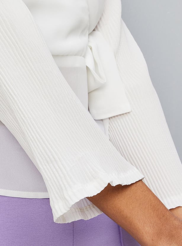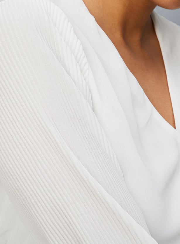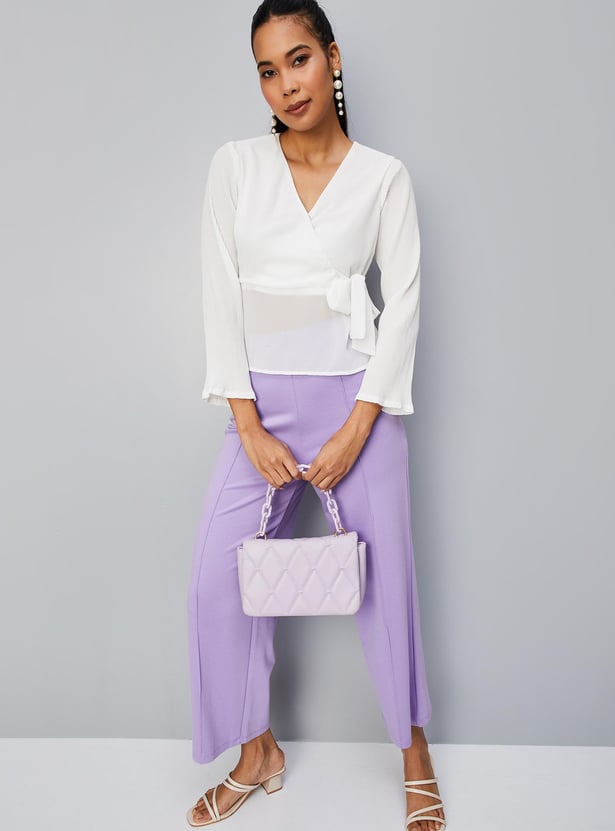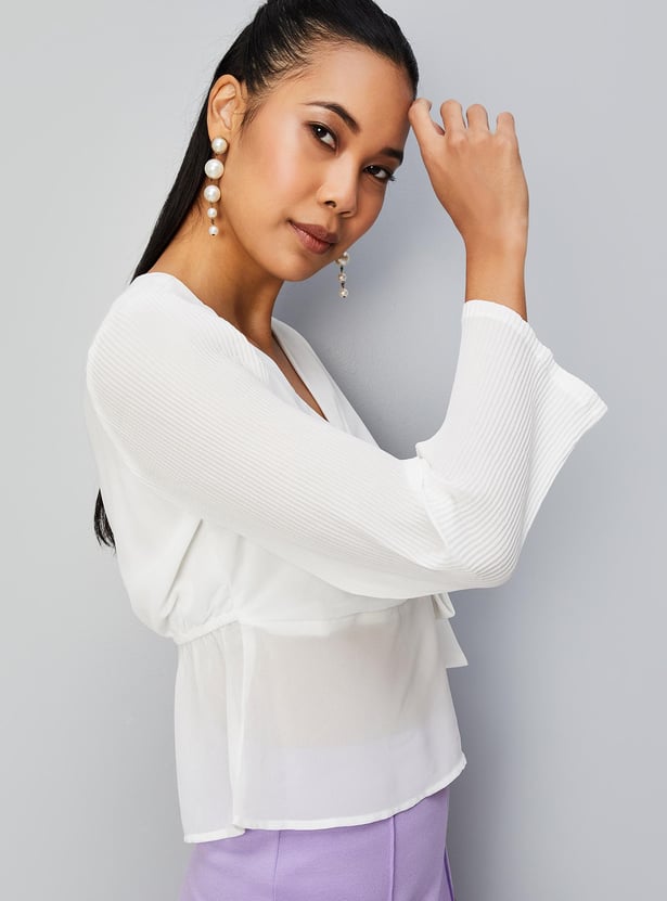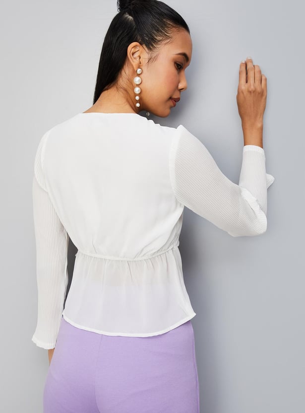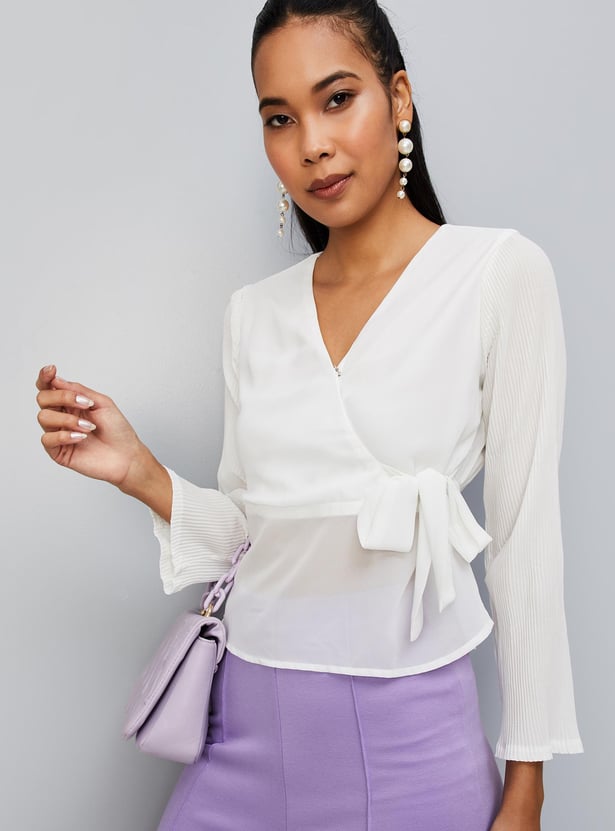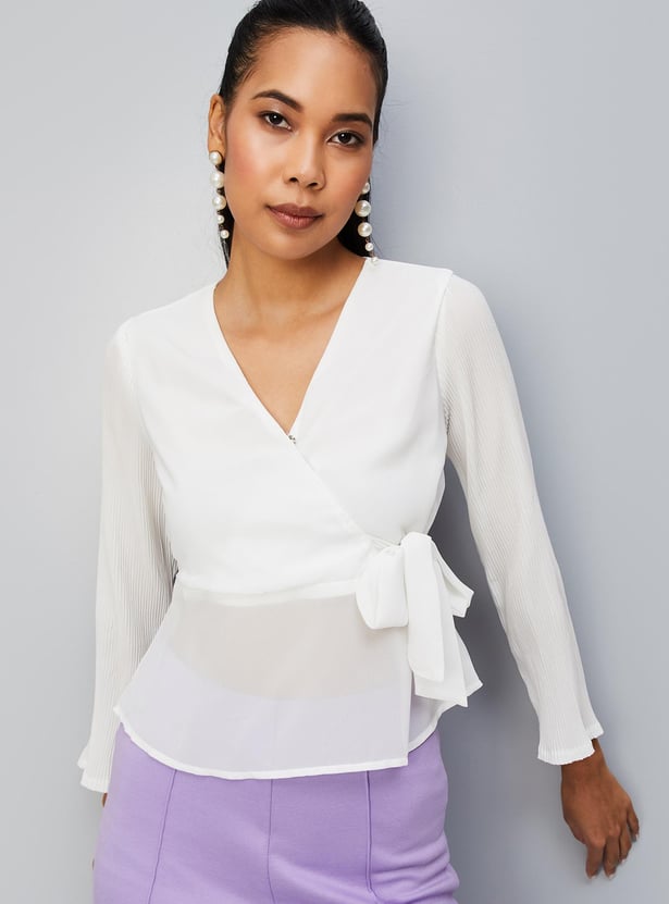 Spruce up your style by adding this solid top to your casual collection. crafted in a wrap profile, it features a surplice neck, pleated full sleeves, a tie-up detail, and a peplum hem. Style this top with trousers and sneakers for an elevated look.