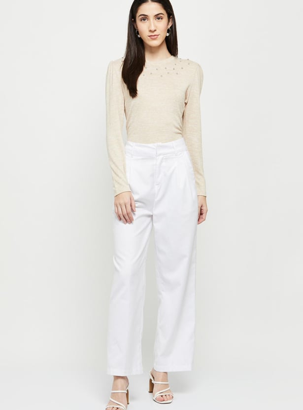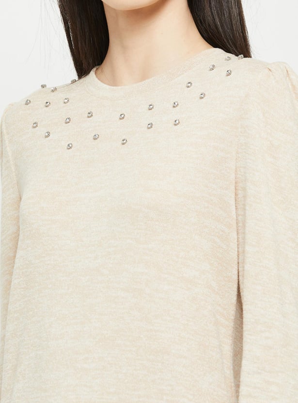 Make a style quotient with this knitted top designed with stone embellishments, round neckline, and full sleeves.