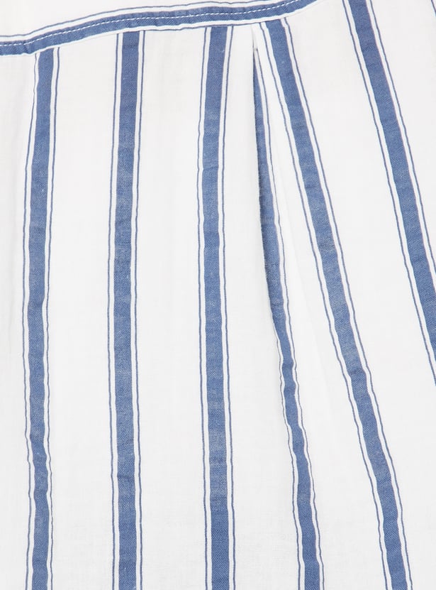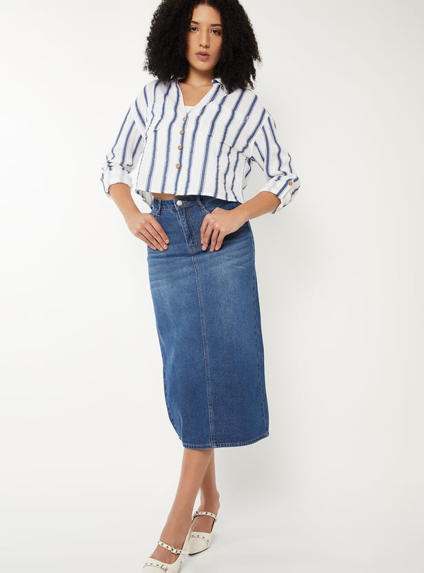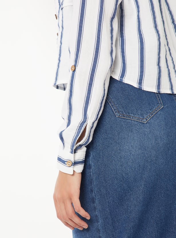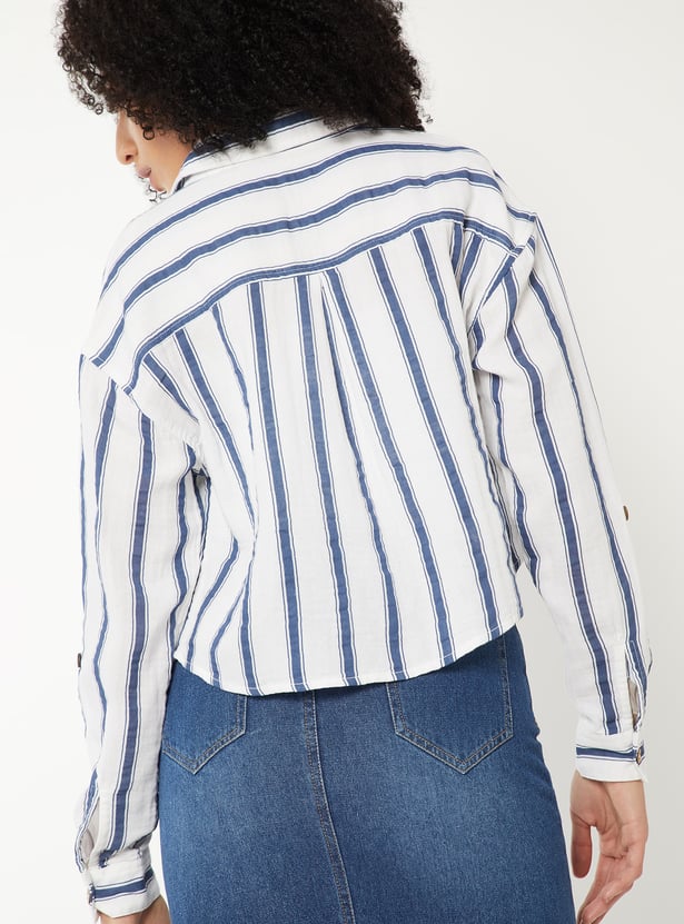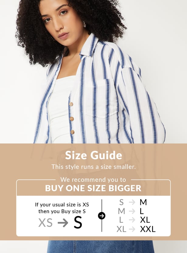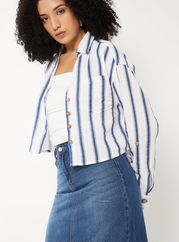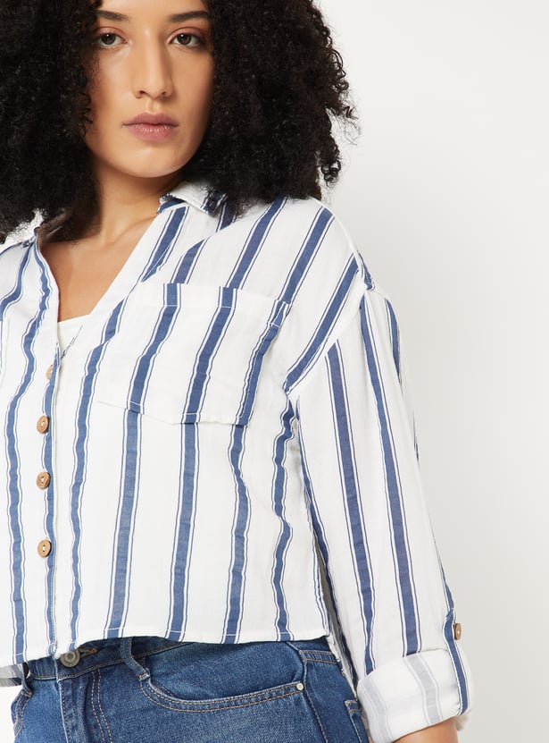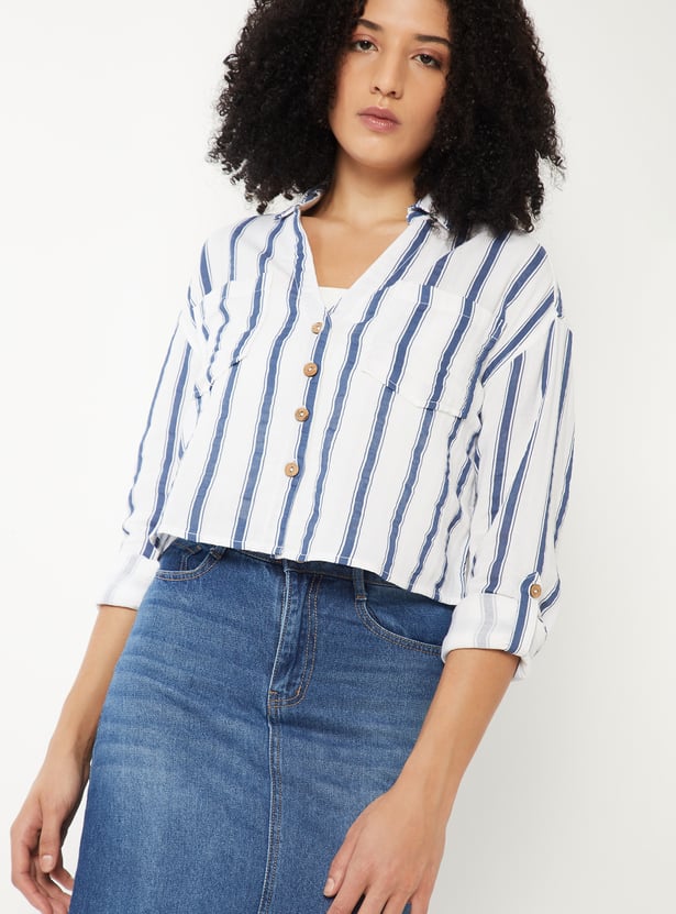 A striped boxy fit crop shirt designed with a spread collar, button-down front, and full roll-up sleeves for versatile styling. The cropped length and relaxed shape make it a stylish choice for casual outings, daytime plans, and off-duty looks.