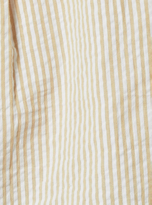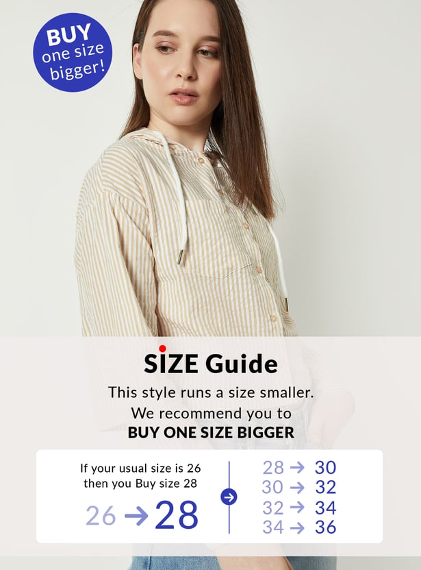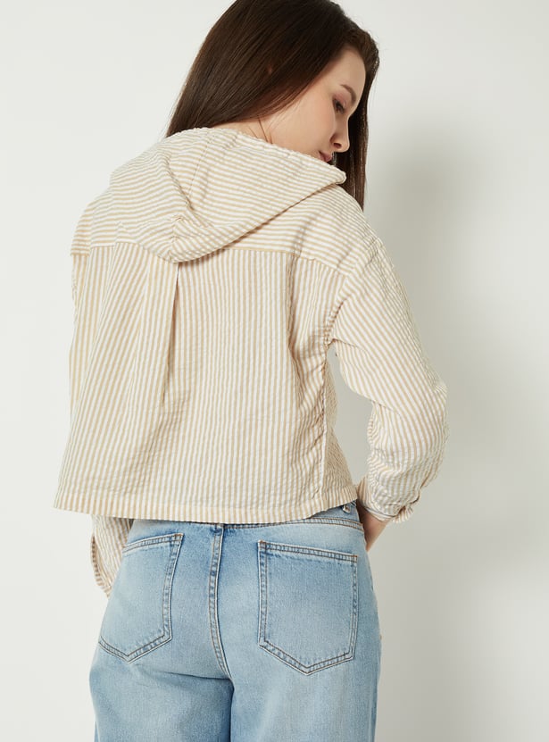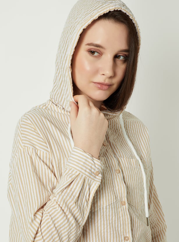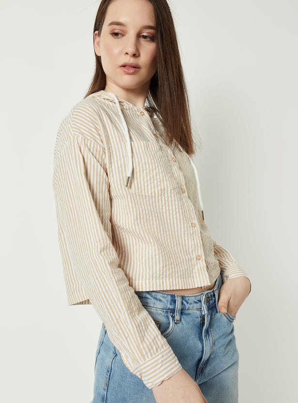 Elevate your casual wardrobe with this striped crop shirt with a hood. Featuring full sleeves with buttoned cuffs and double patch pockets on the chest, it combines style with functionality. The hood adds a sporty touch, while the cropped profile keeps it modern and trendy.