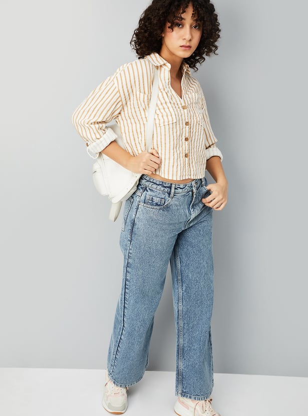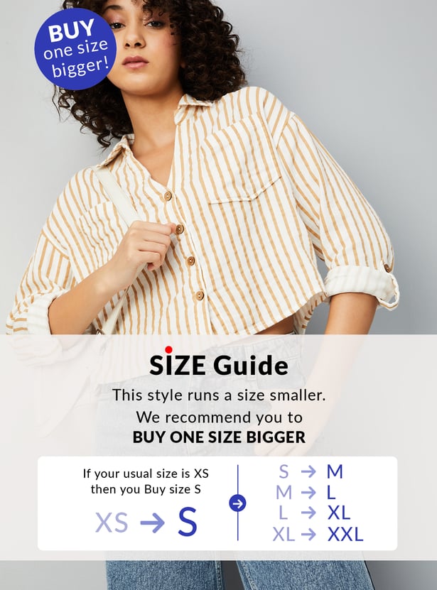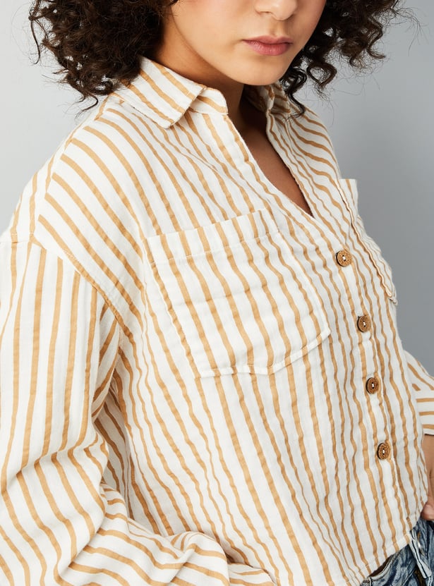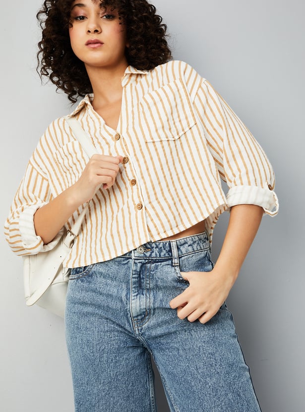 Elevate your style with this women's striped cropped shirt. Featuring a spread collar, full sleeves, and a flap pocket, it blends modern design with timeless elegance for a chic, contemporary look.