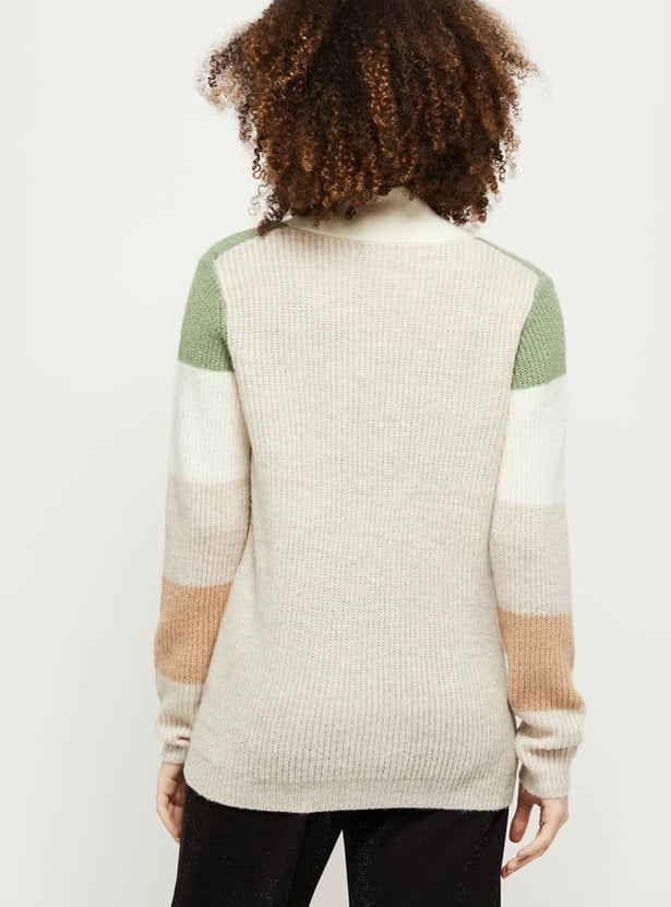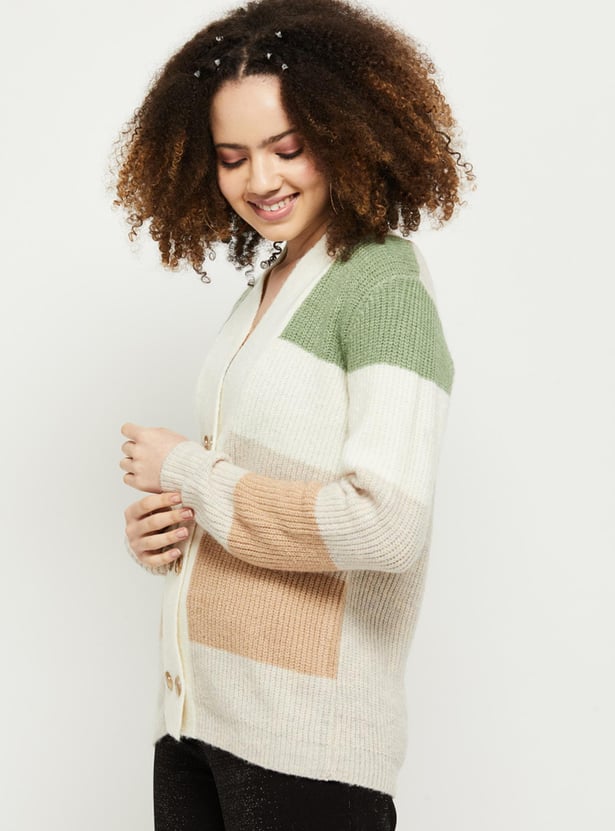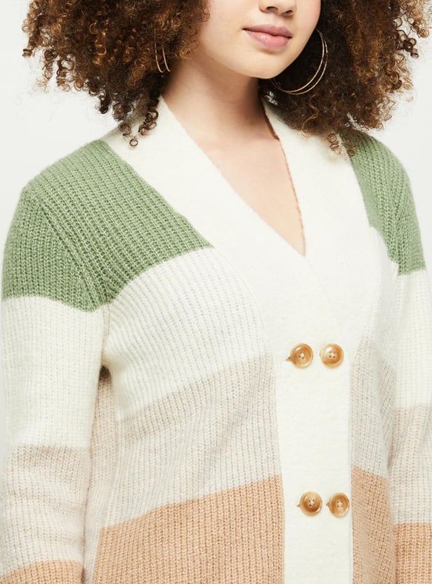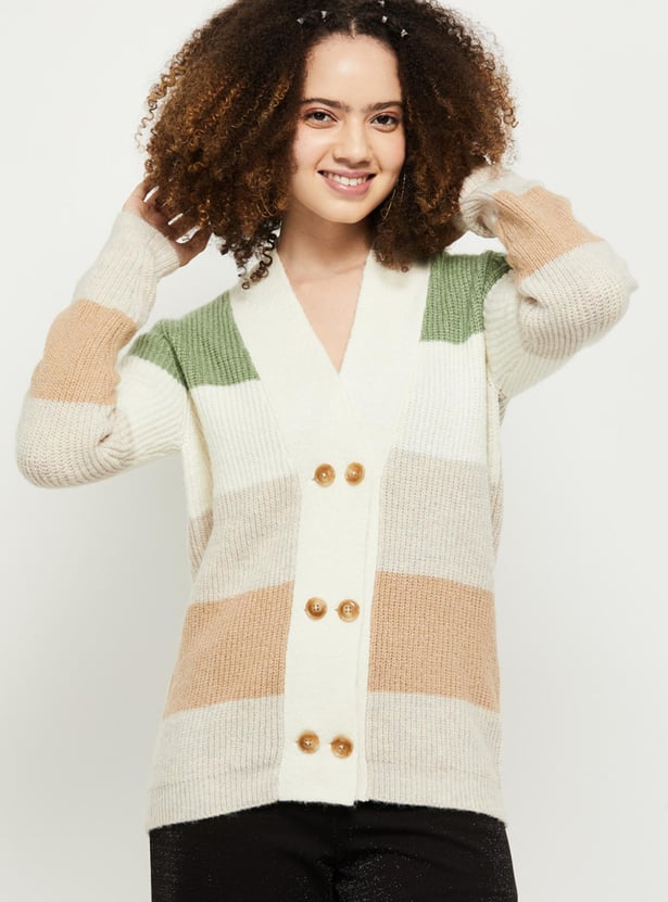 Style your winter wear with this striped cardigan designed with full sleeves, V-neckline, and a ribbed hem. It looks best when layered over a top, jeans, and flat sandals.