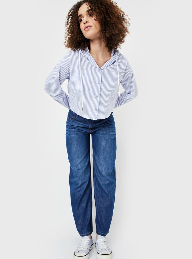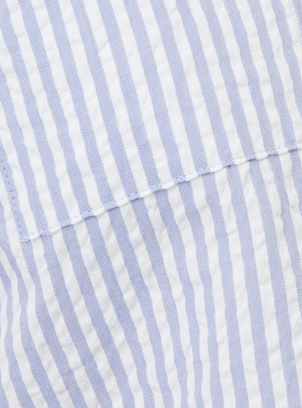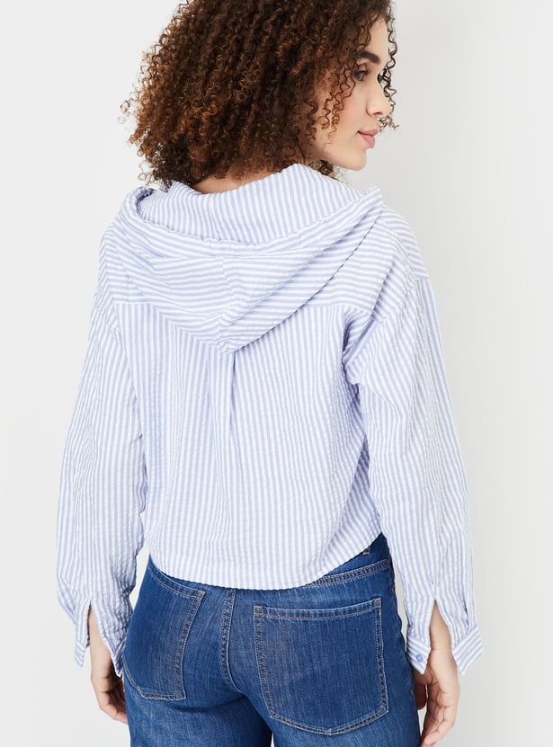 Elevate your fashion game with this striped seersucker shirt, designed to make a statement. Featuring a trendy cropped silhouette, hooded neckline, full sleeves with buttoned cuffs, and two patch pockets, it effortlessly combines style and functionality.