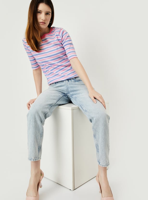 A perfect addition to your casual wardrobe, this T-shirt features a timeless striped pattern. Designed with a round neckline and half sleeves, it effortlessly combines comfort and style for your everyday look.