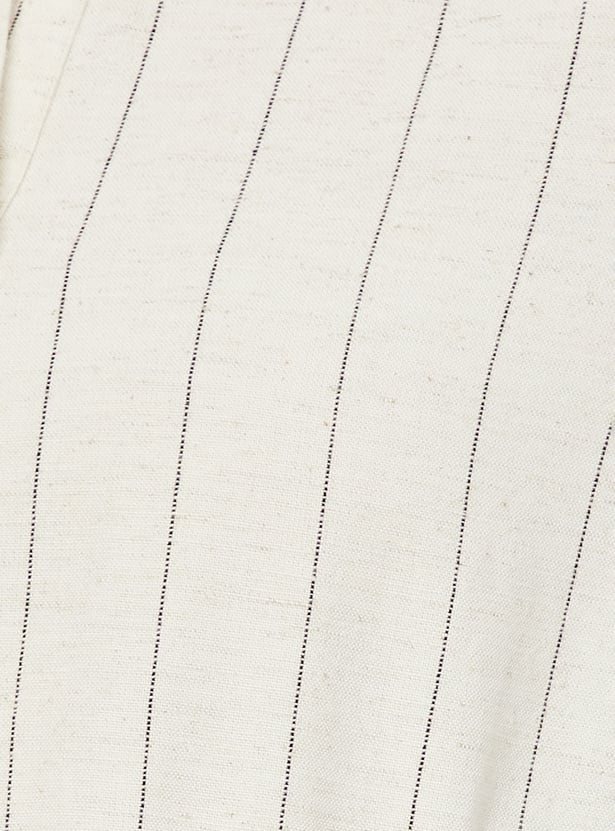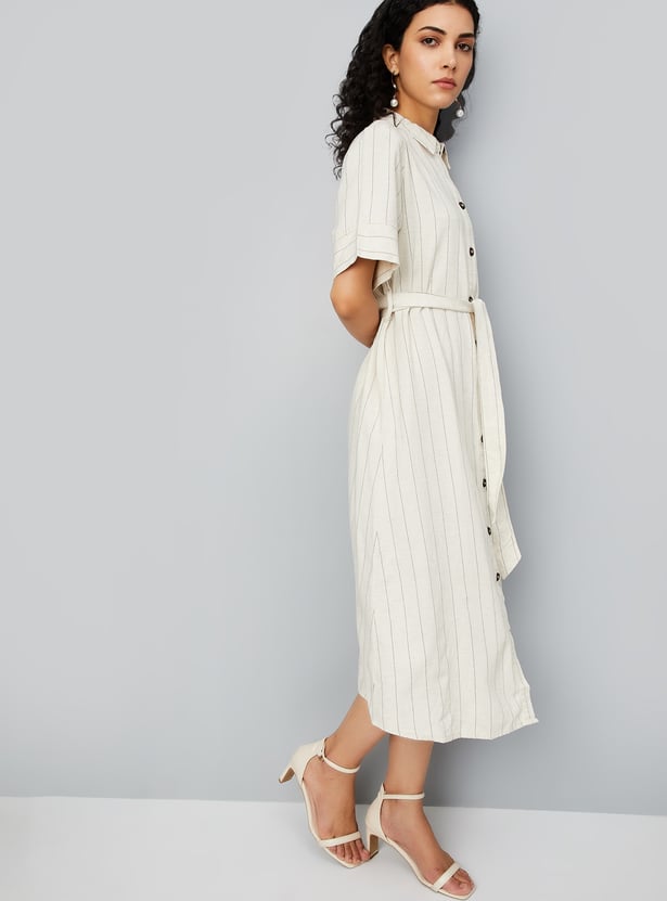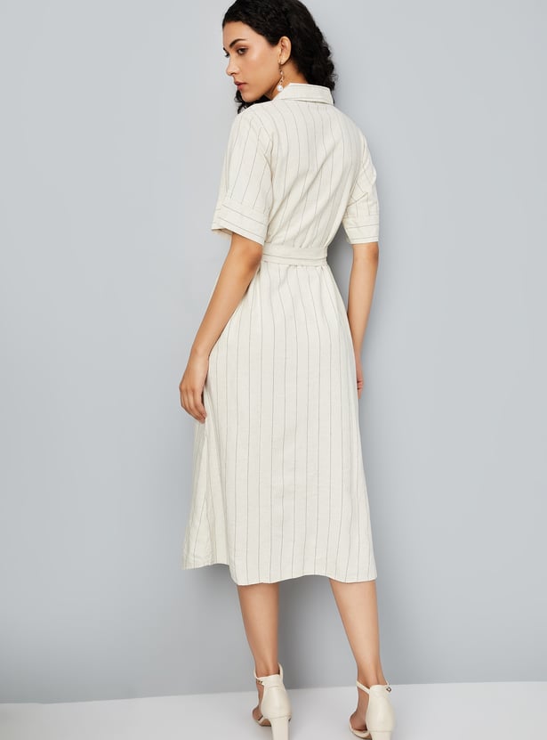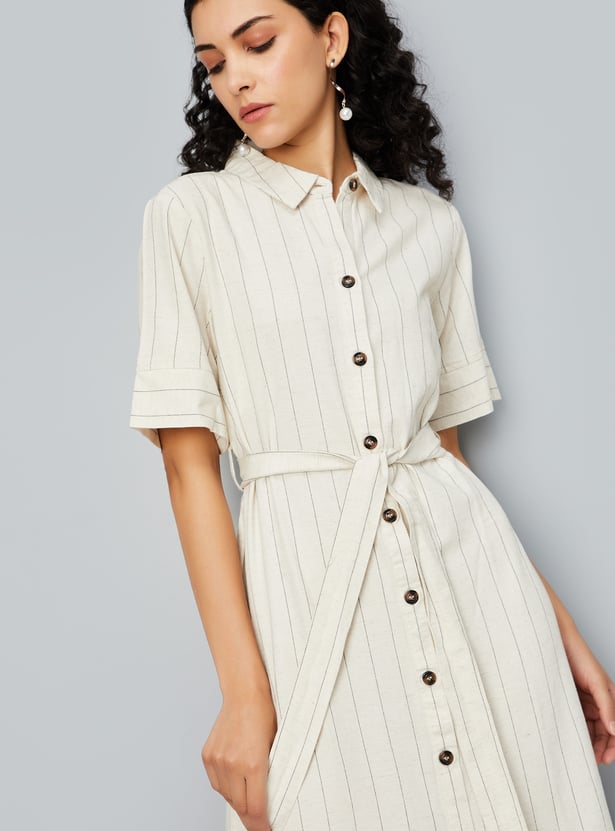 Upgrade your wardrobe with this chic striped shirt dress, featuring a spread collar, button placket, and a tie-up belt to accentuate the waist. The half sleeves add a touch of practicality, combining classic elegance with a modern silhouette for effortless style.