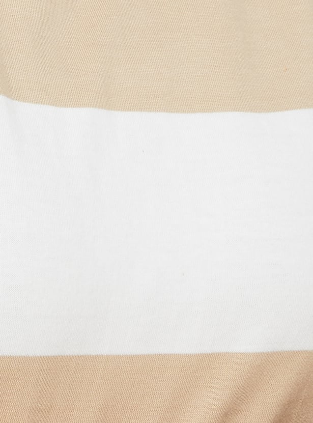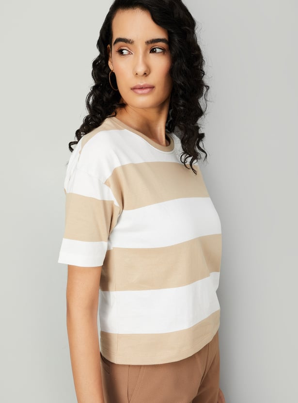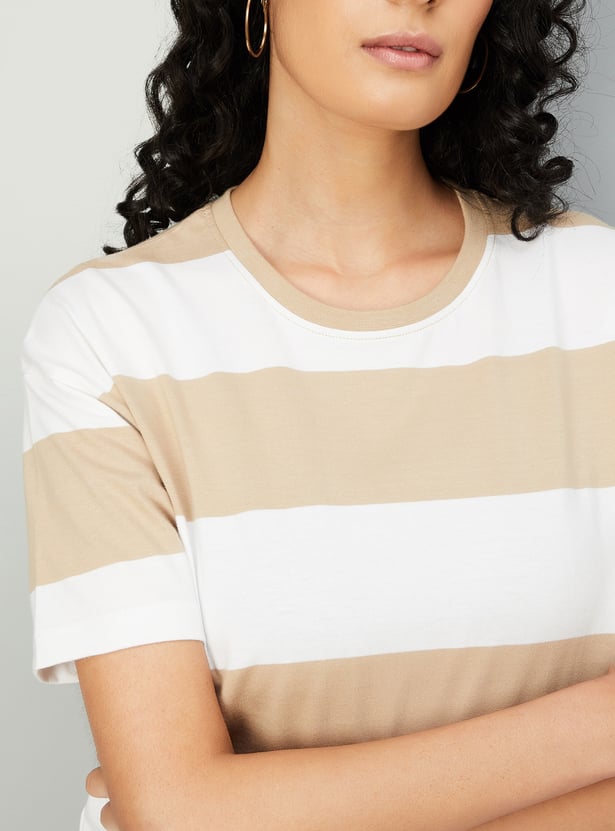 A basic addition to your casual rotation, this T-shirt is updated with a striped pattern. it is designed with a ribbed round neckline, drop shoulders and short sleeves.