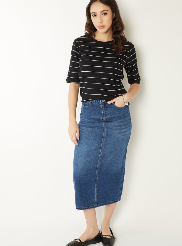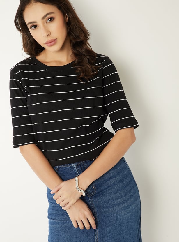 Add a pop of personality to your casual wardrobe with this striped T-shirt, featuring a round neck and half sleeves for breezy comfort. The stripes add charm, making it perfect for brunch dates, errands, or laid-back days.