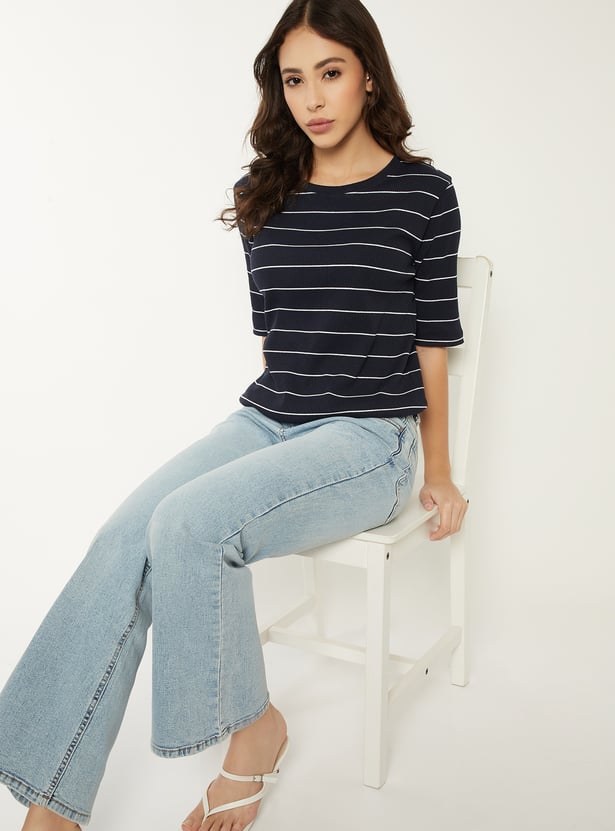 Add a pop of personality to your casual wardrobe with this striped T-shirt, featuring a round neck and half sleeves for breezy comfort. The stripes add charm, making it perfect for brunch dates, errands, or laid-back days.
