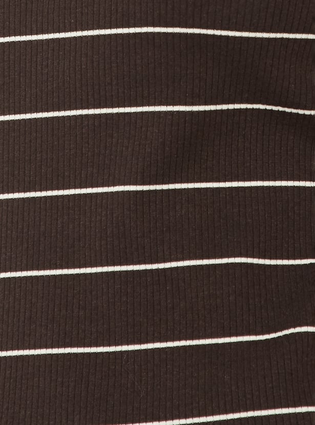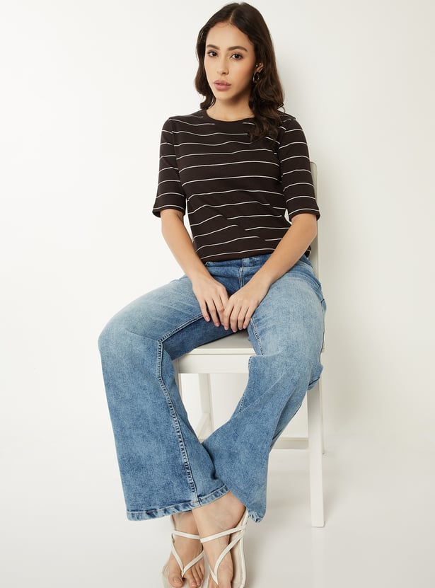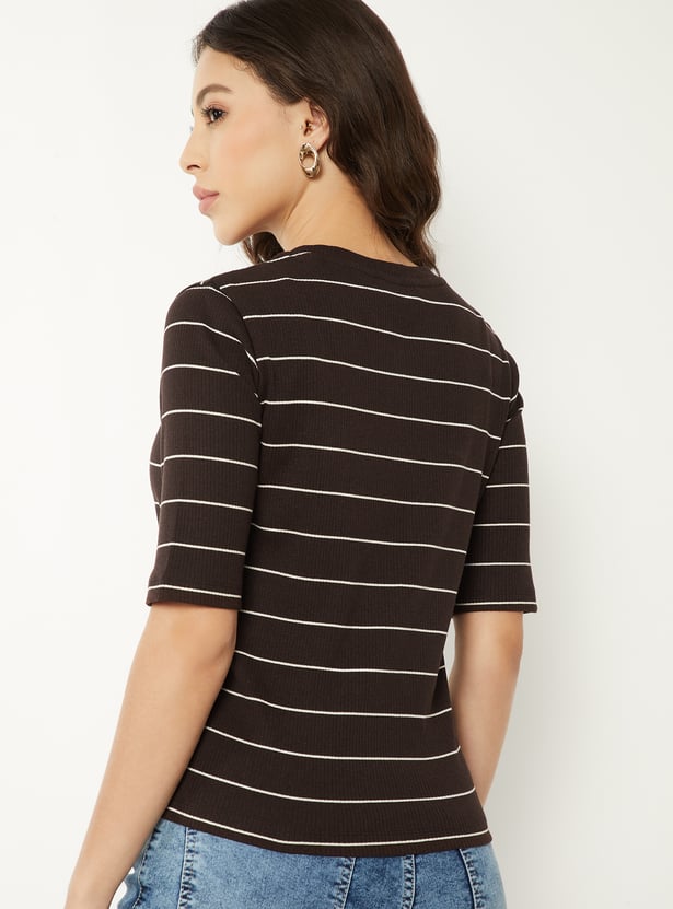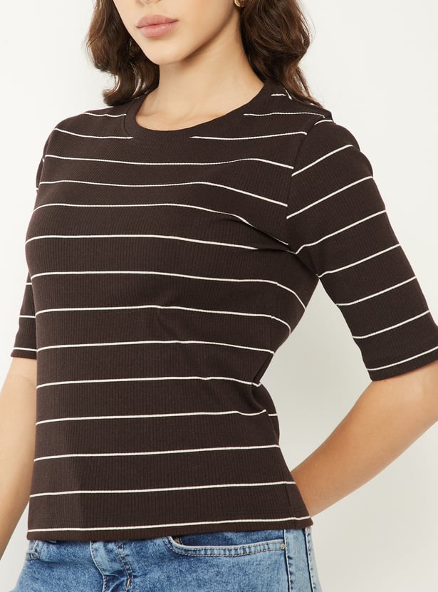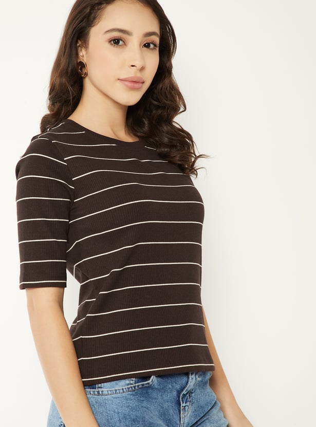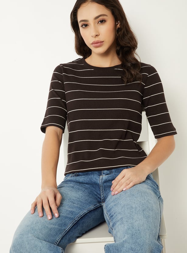 Add a pop of personality to your casual wardrobe with this striped T-shirt, featuring a round neck and half sleeves for breezy comfort. The stripes add charm, making it perfect for brunch dates, errands, or laid-back days.