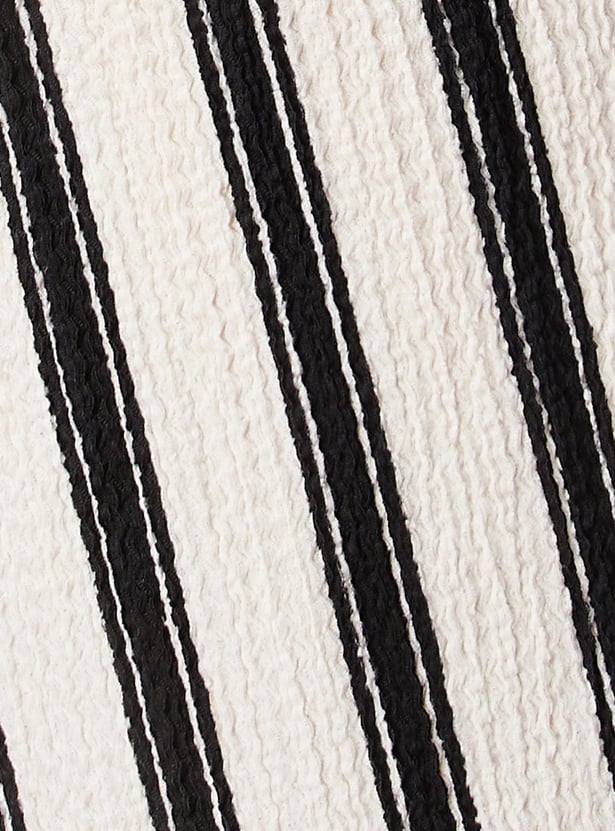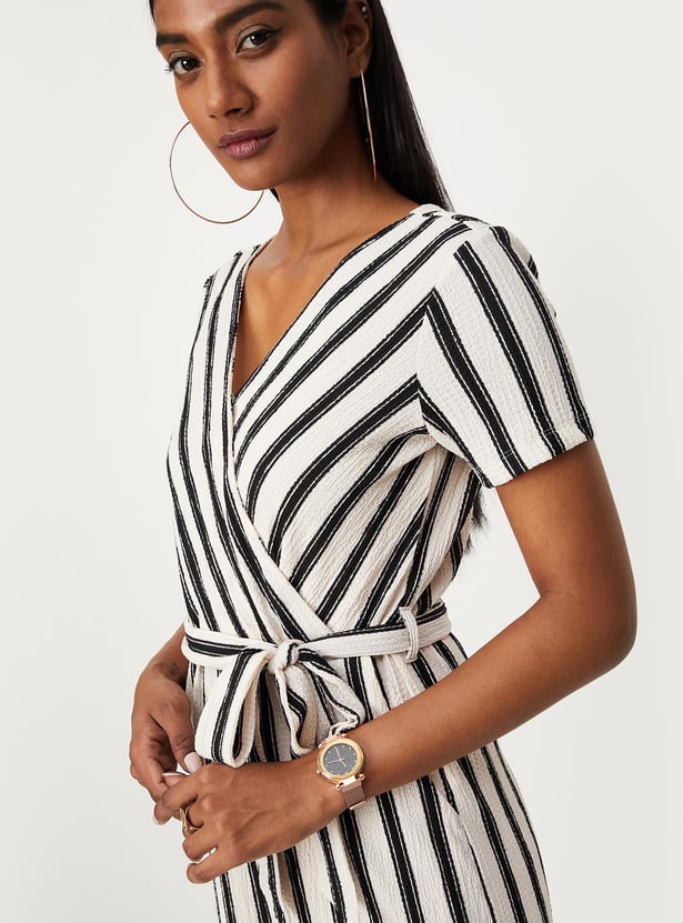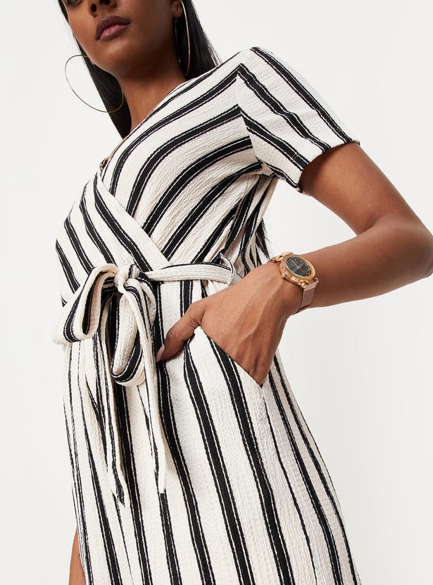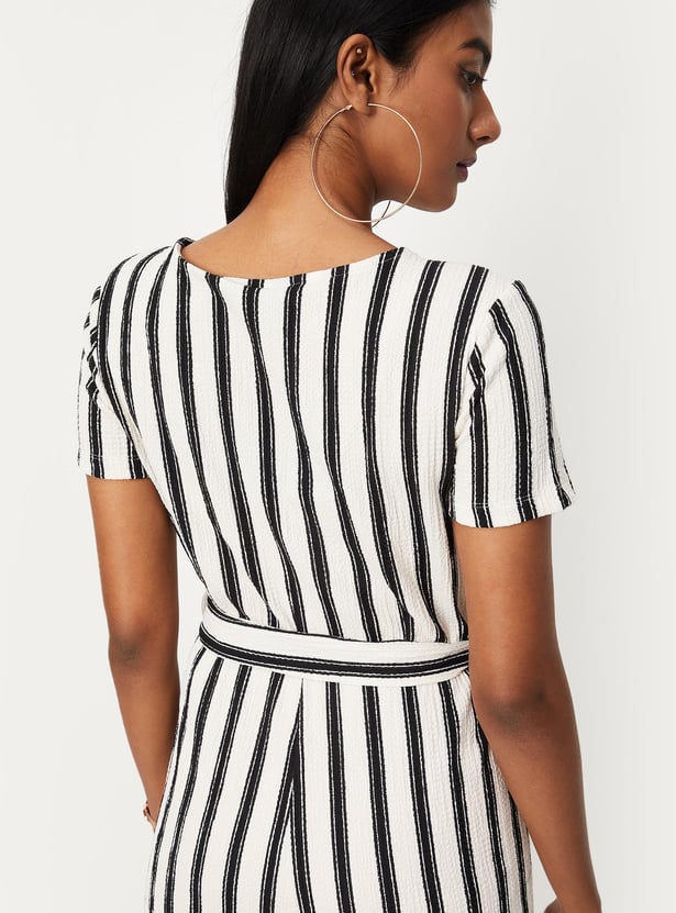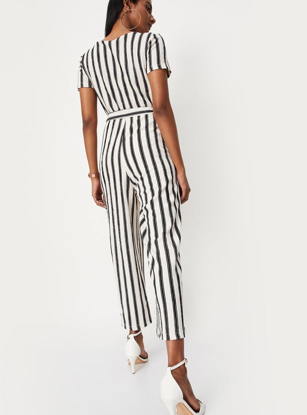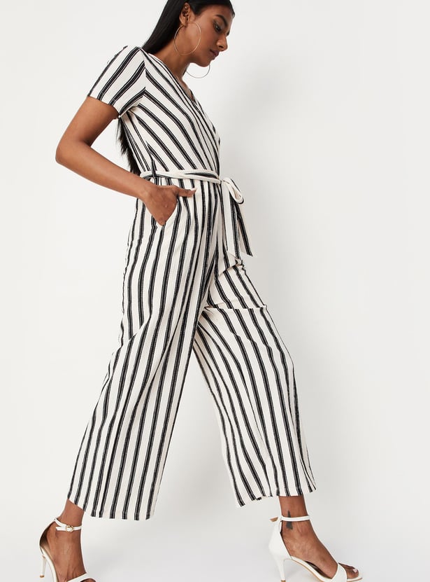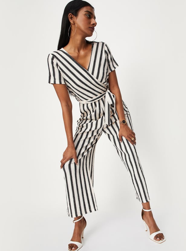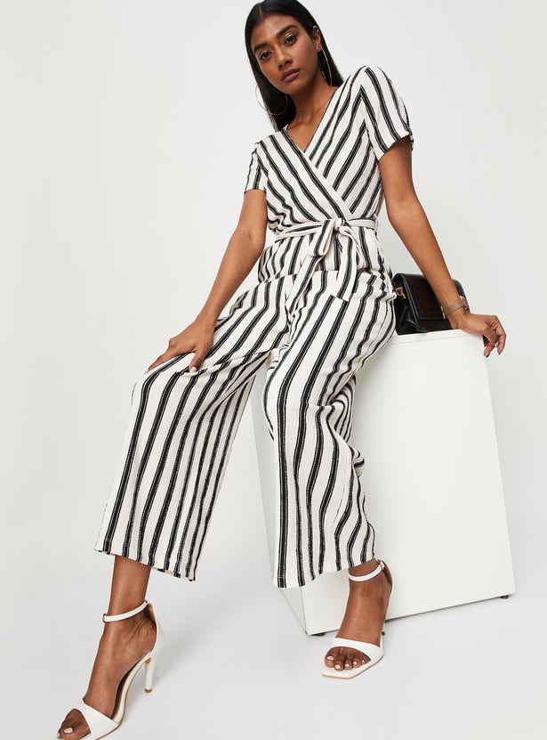 Breeze through the day in chic style with this jumpsuit that is highlighted with a striped pattern. it features a wrap bodice with a surplice neck, short sleeves, and a fabric belt at the waist. Side pockets and wide legs complete the look. Pair this jumpsuit with high heels and a sling bag for an elevated day look.