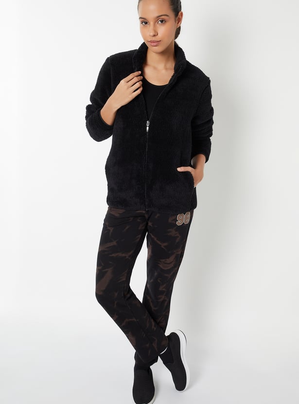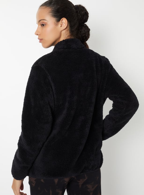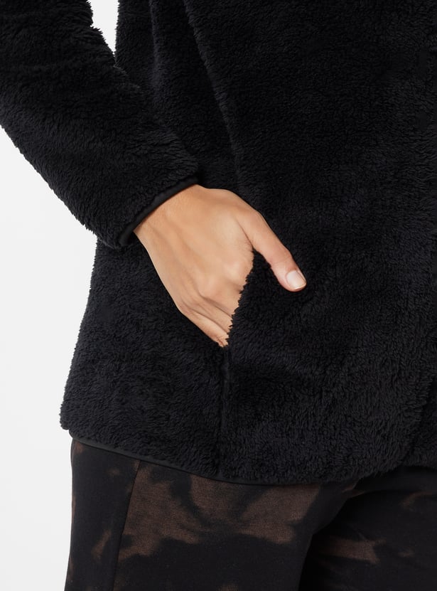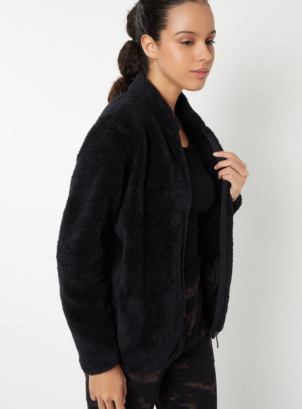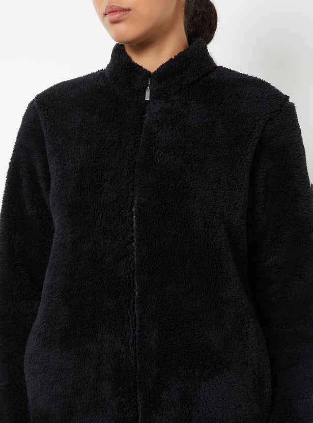 This teddy jacket adds a luxe touch to your cold-weather wardrobe. Featuring a stand collar, zip closure, and side pockets, it combines warmth with sleek, cozy style. Model Size :