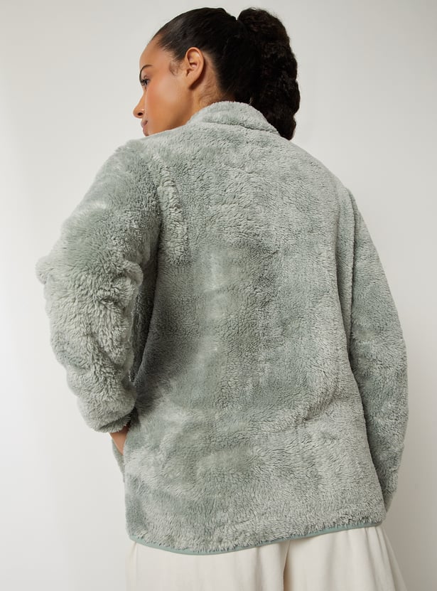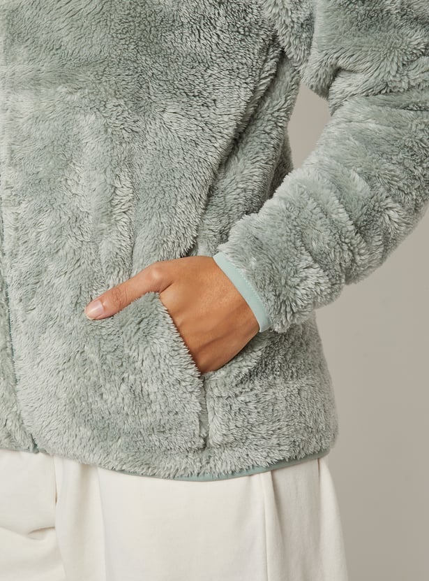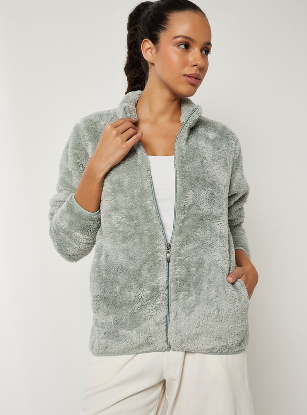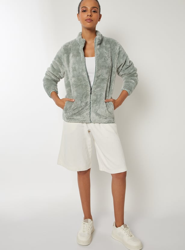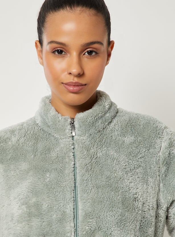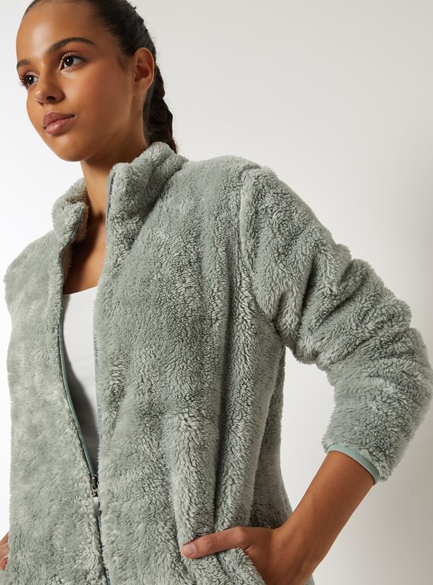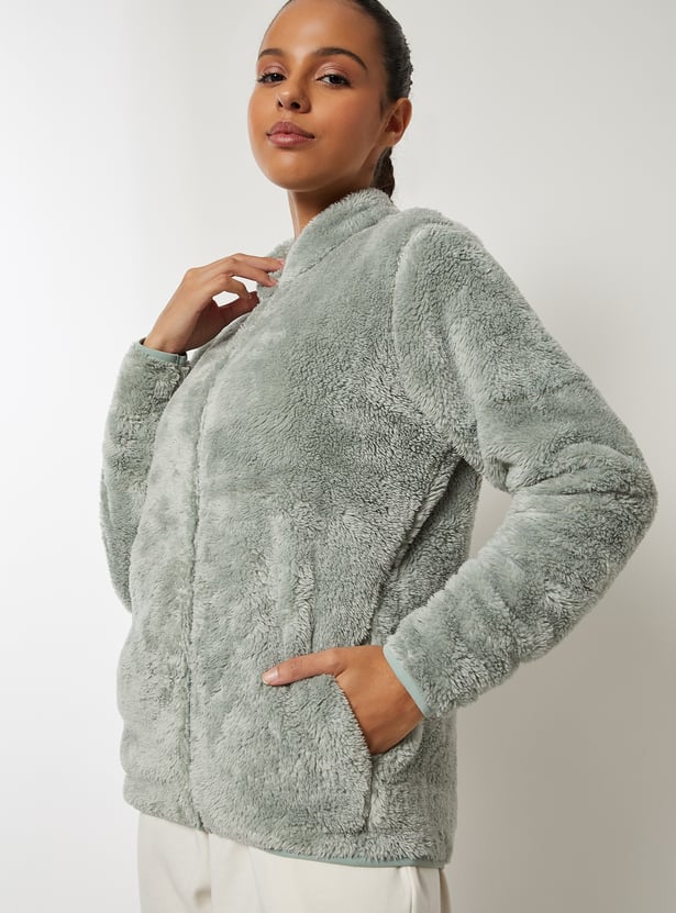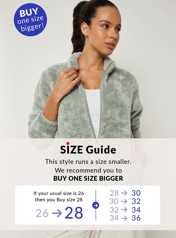 This teddy jacket adds a luxe touch to your cold-weather wardrobe. Featuring a stand collar, zip closure, and side pockets, it combines warmth with sleek, cozy style. Model Size :