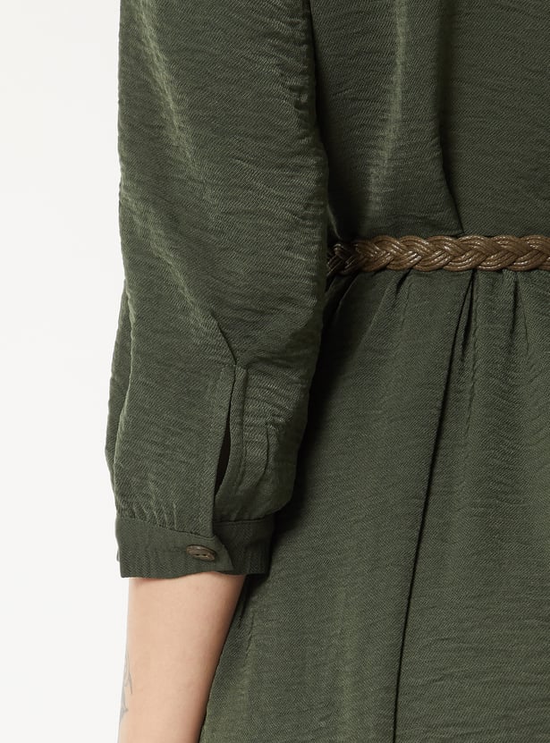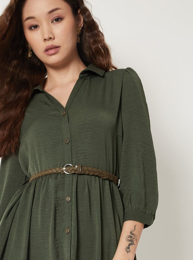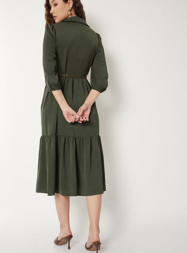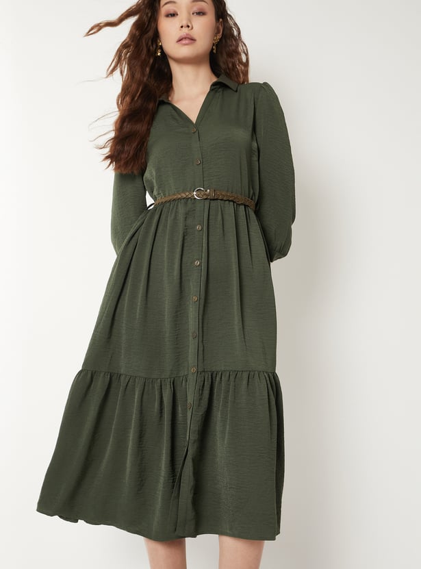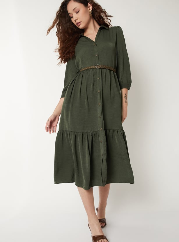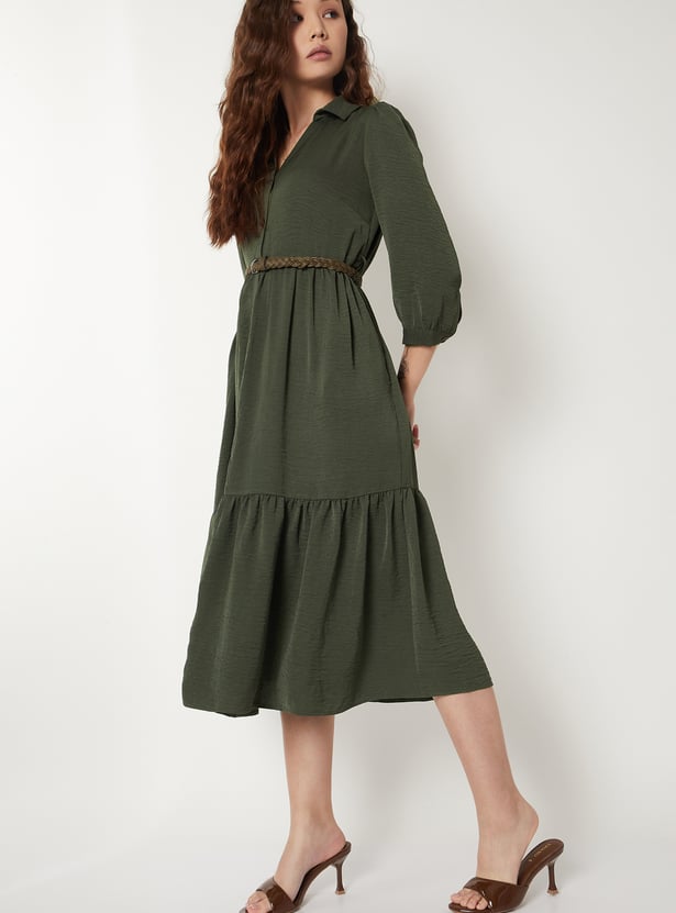 Women Textured A-line Tiered Shirt Dress with Belt