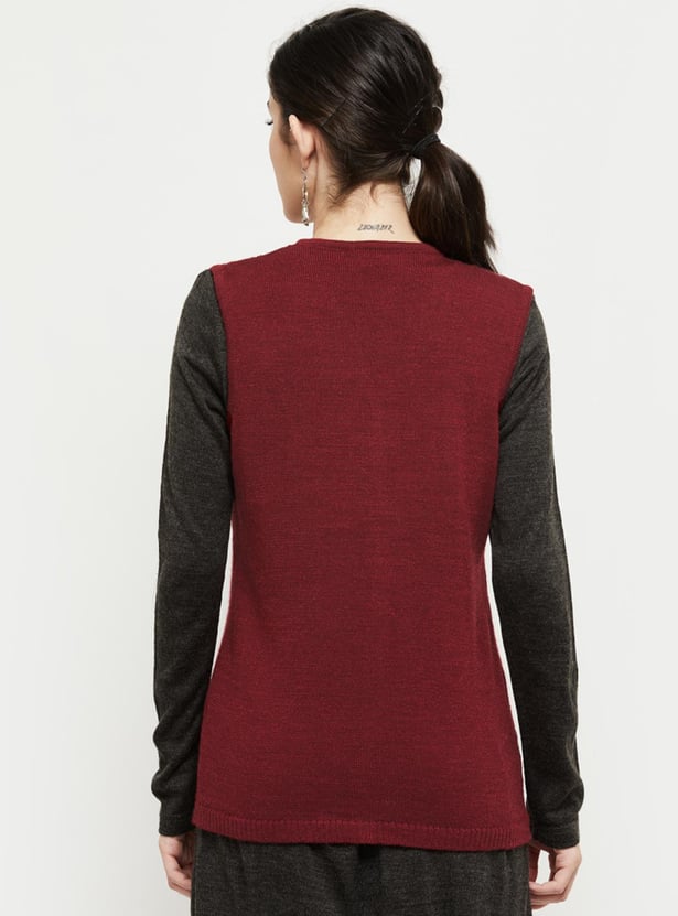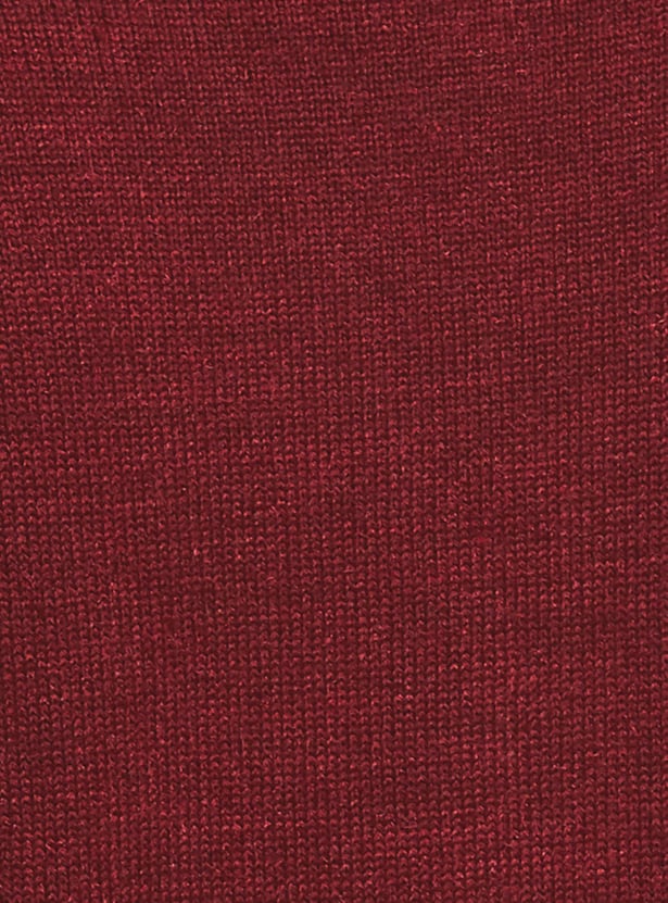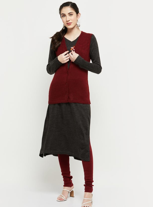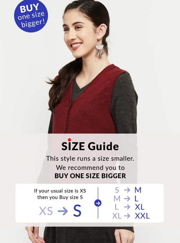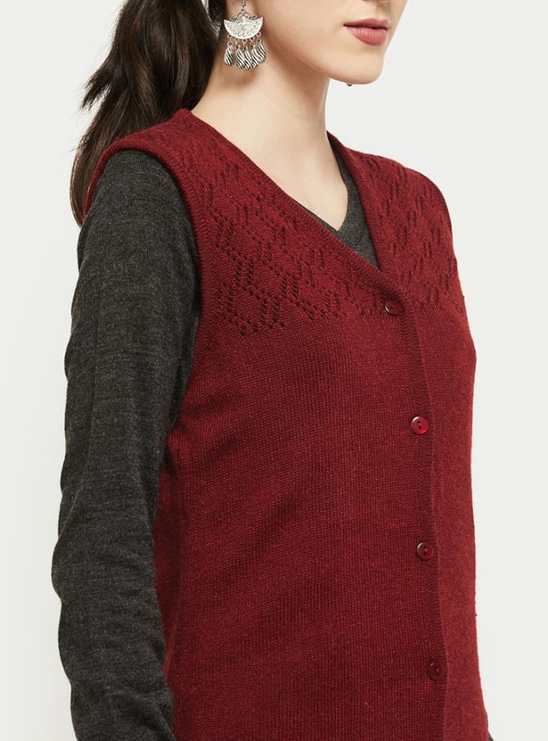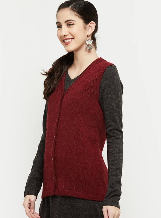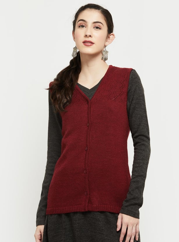 Cosy up your outfit with this cardigan featuring a V-neckline, perforated panel, sleeveless profile, and ribbed trim. Layer up this cardigan over a long sleeve top or kurta for a warm, stylish look.