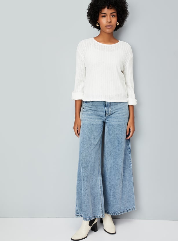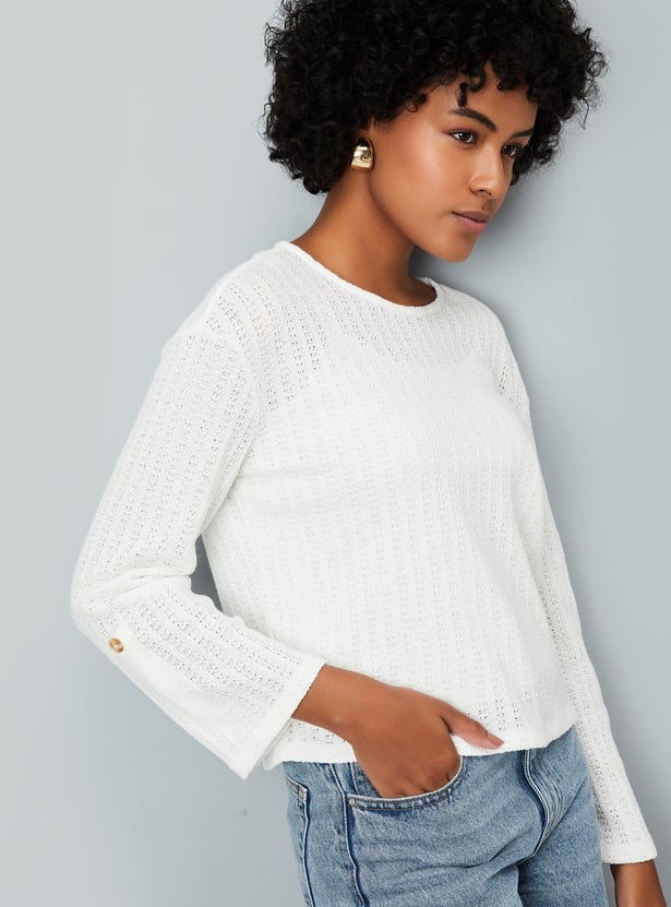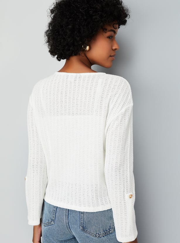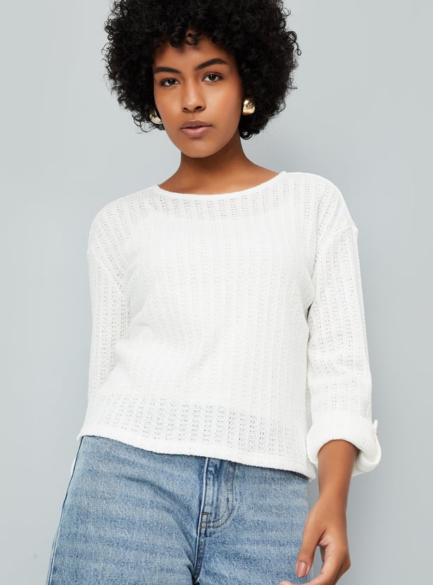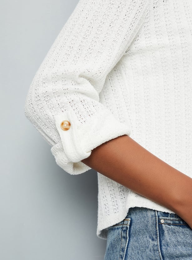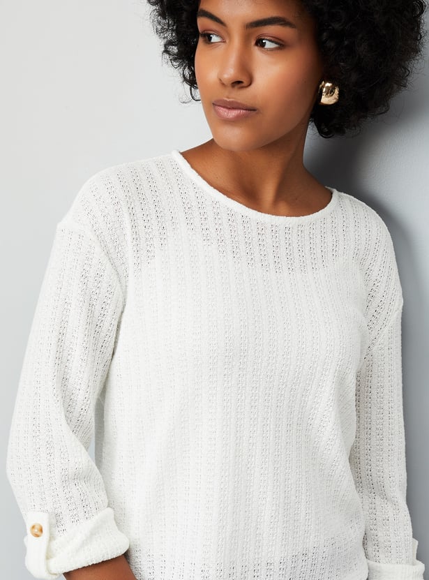 Elevate your casual wardrobe effortlessly with this chic knit top. Featuring a round neck and stylish three-quarter sleeves with roll-up tabs, it adds a touch of sophistication to any outfit.