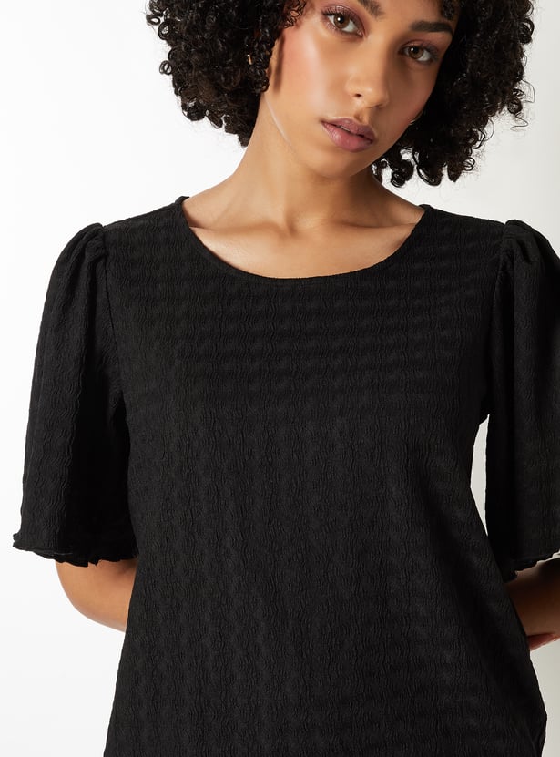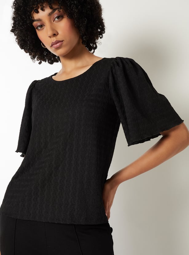These textured top features a round neck and half sleeves, offering a clean and elegant silhouette. The subtle texture adds depth, making it a versatile piece for both casual and polished looks. Model Size :