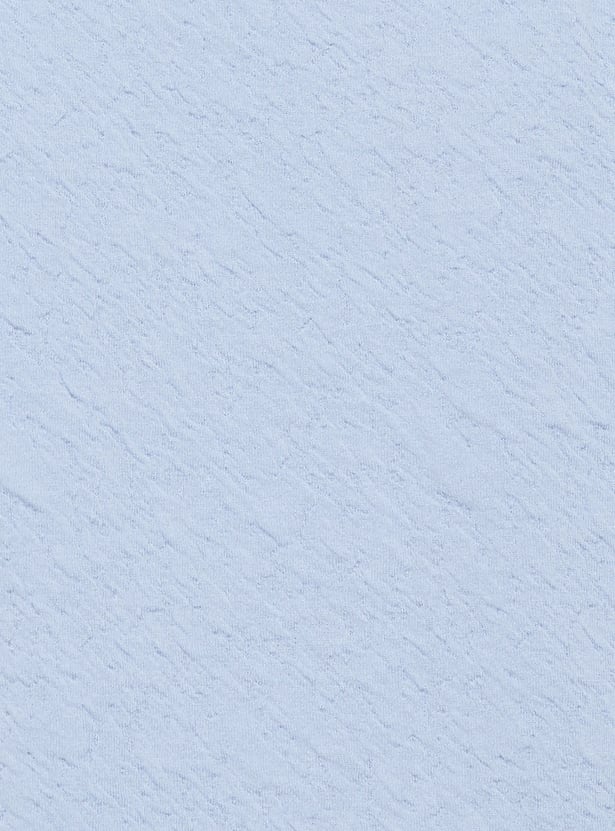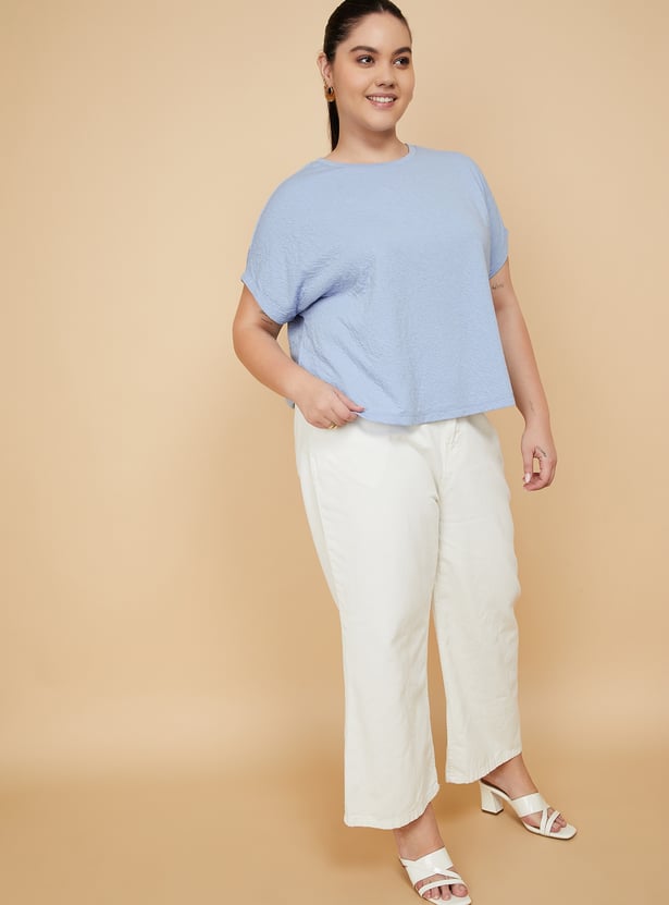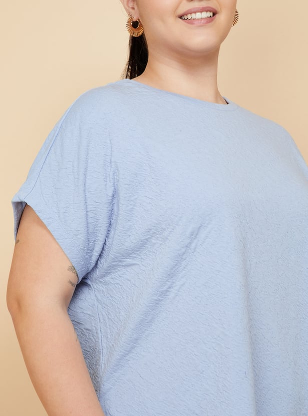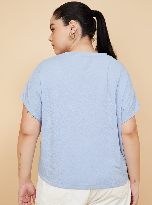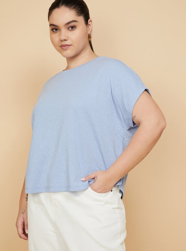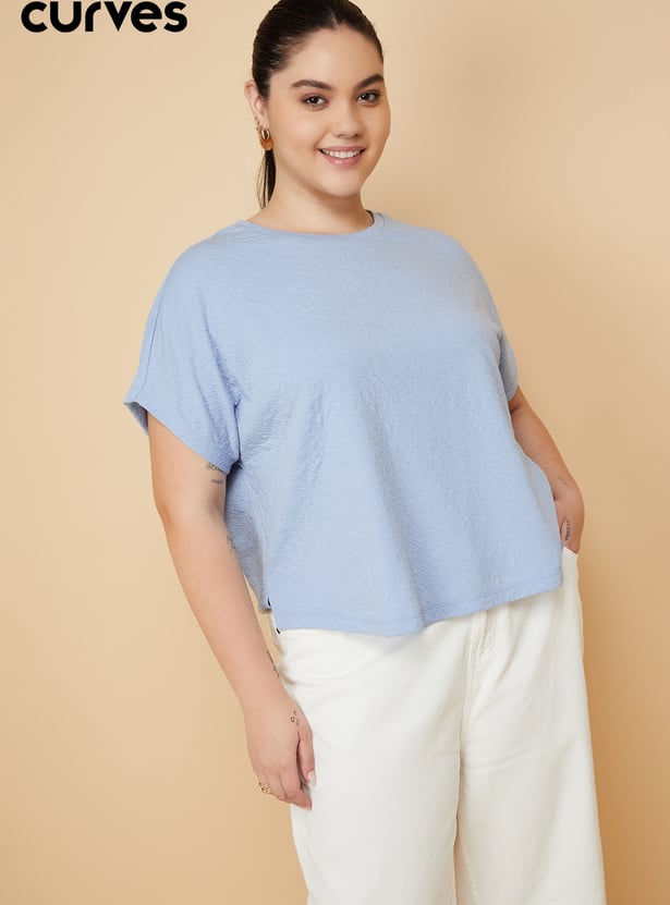 This textured top features a round neck and half sleeves with extended detailing for a unique, stylish touch. Its subtle texture adds dimension to your everyday essentials. Model Size :