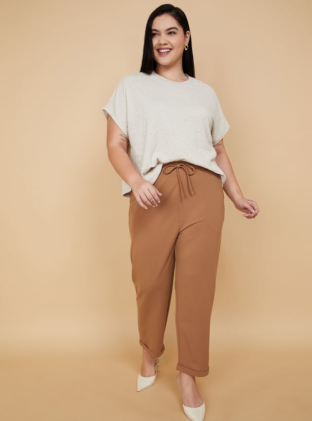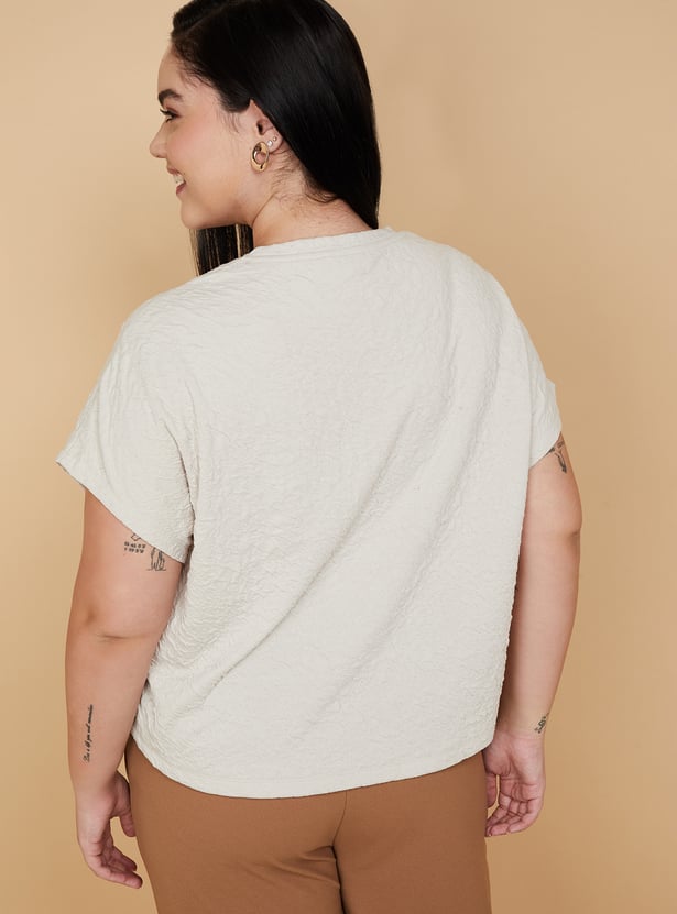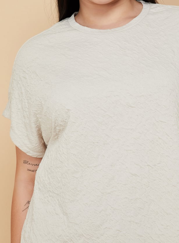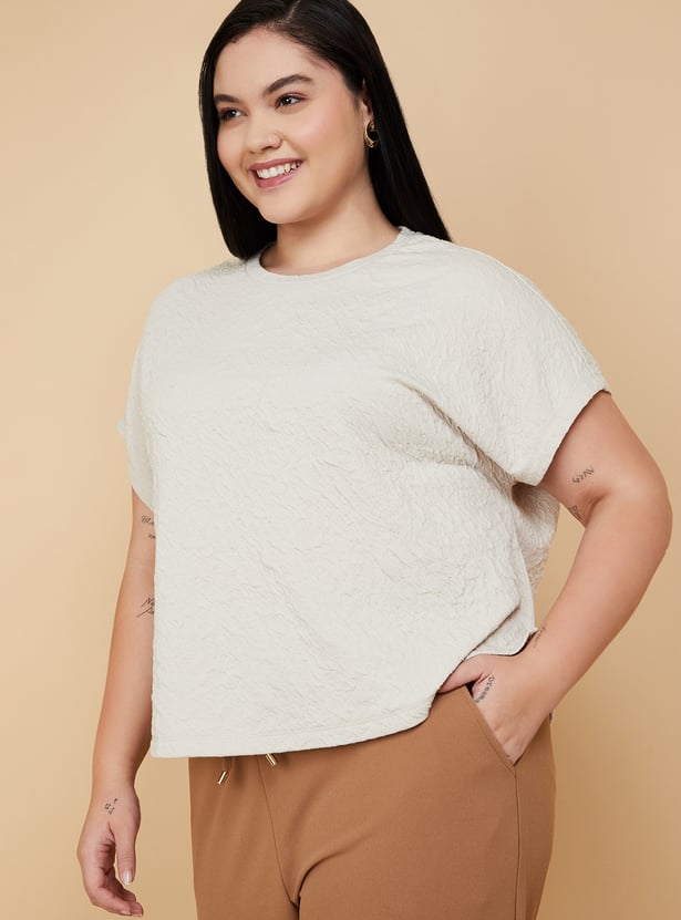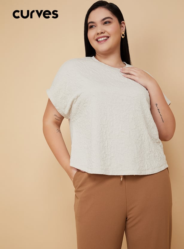 This textured top features a round neck and half sleeves with extended detailing for a unique, stylish touch. Its subtle texture adds dimension to your everyday essentials. Model Size :