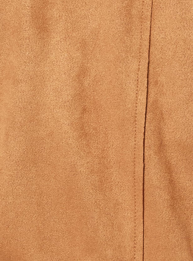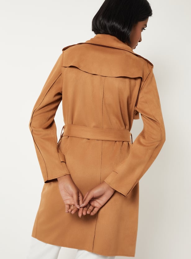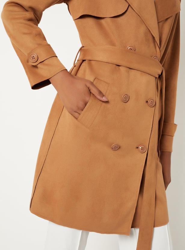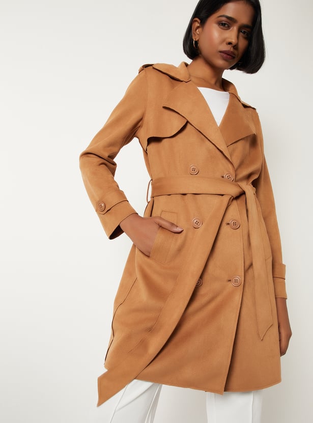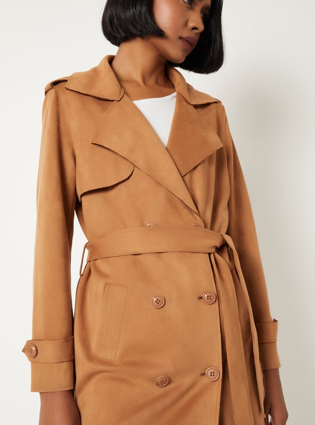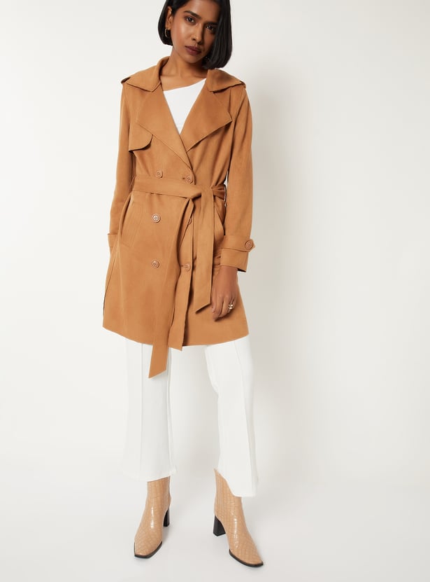 Elevate your outerwear collection with this textured suede trench coat, featuring a classic lapel collar, button closure, full sleeves, and functional pockets. The waist tie-up adds a flattering, adjustable fit for a timeless silhouette. Model Size :