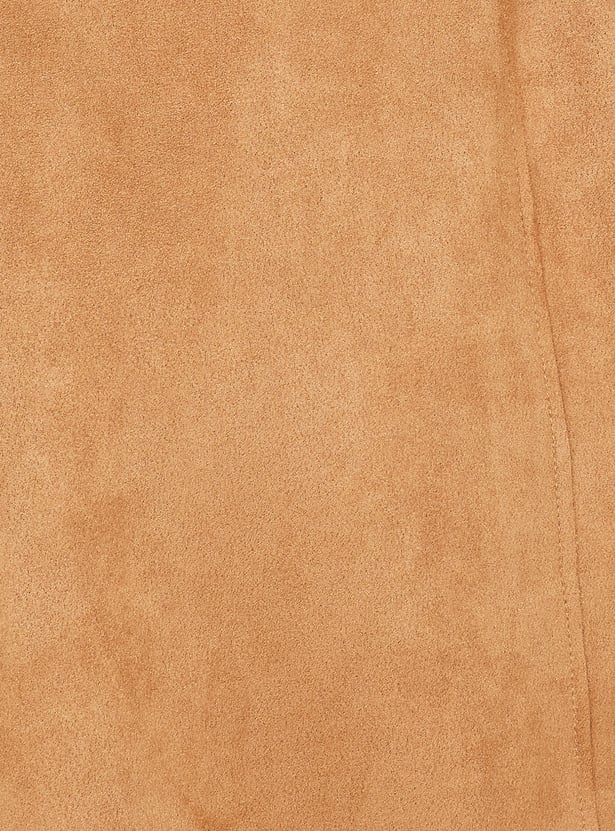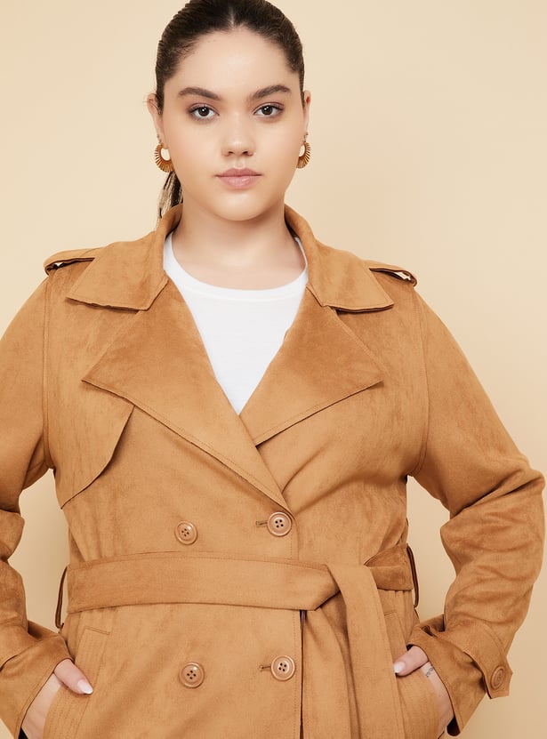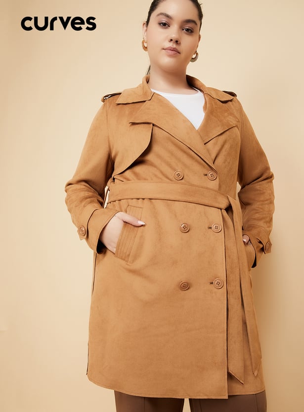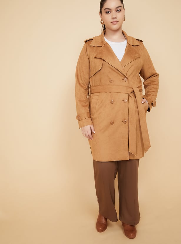 Elevate your outerwear collection with this textured suede trench coat, featuring a classic lapel collar, button closure, full sleeves, and functional pockets. The waist tie-up adds a flattering, adjustable fit for a timeless silhouette. Model Size :