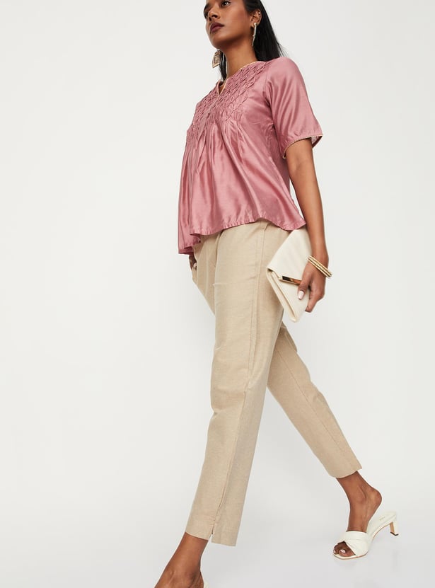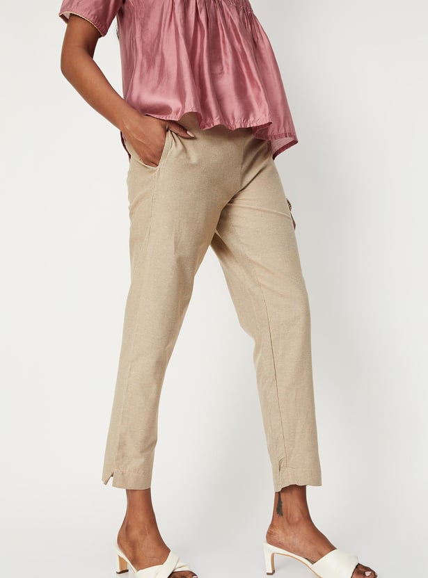 Make an elegant statement with this pair of straight pants that are highlighted with zigzag woven patterns. It is designed with an elasticated waist, side pockets, and side slits at the hem. Team up this pair of pants with a top and block heels for a refined look.