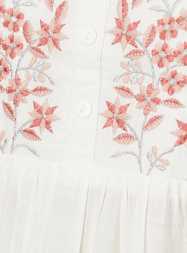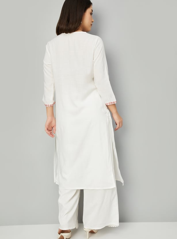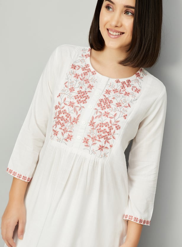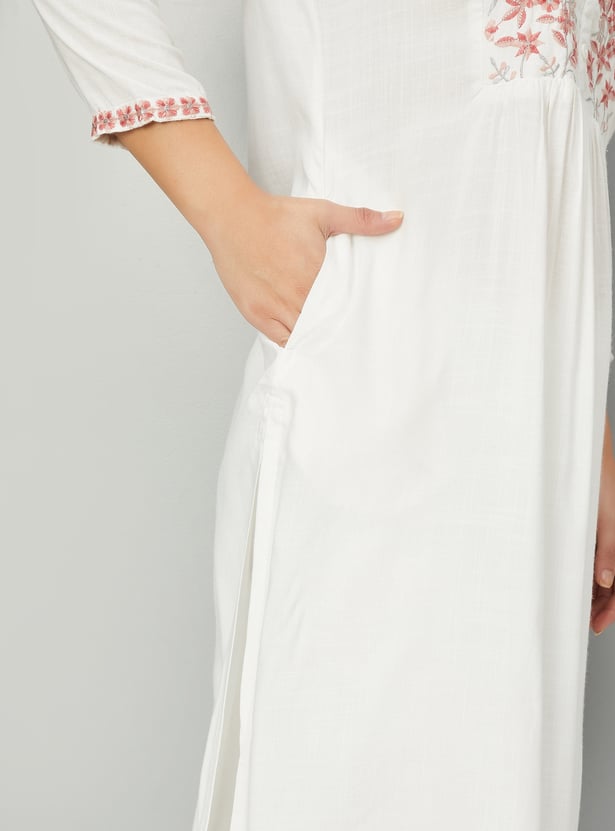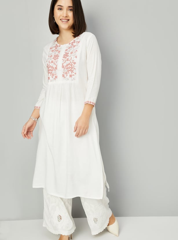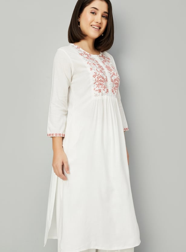 Create an effortless look with this straight kurta. It has three-quarter sleeves, side pocket, slide slits, a round neck with an embroidery design on the yoke, gathered detail on the waist and a button placket.