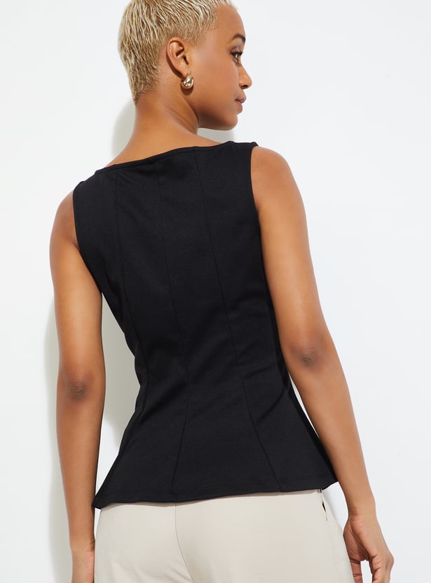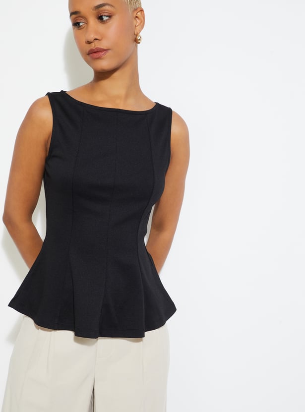 Amp up your wardrobe with this solid top, featuring a chic boat neck and sleeveless design. The flattering peplum silhouette adds a touch of elegance while keeping it versatile for both casual and dressy looks.