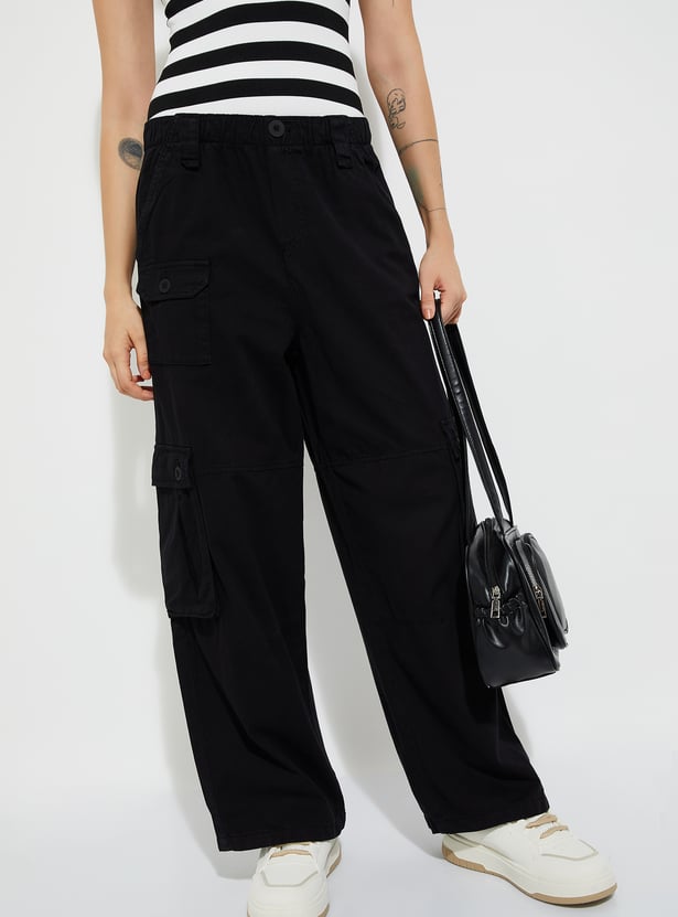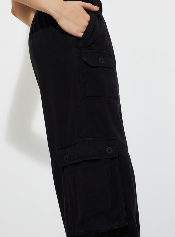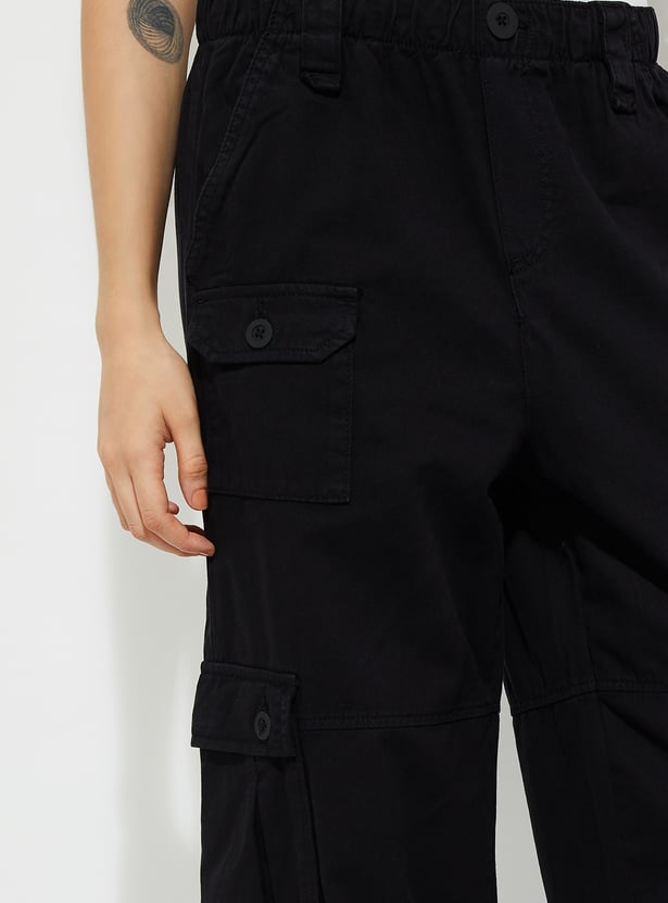 Add utility style to your wardrobe with these women’s textured cargos, designed for comfort and edge. Featuring a button closure, belt loops, and multiple pockets, they combine practicality with a modern silhouette.