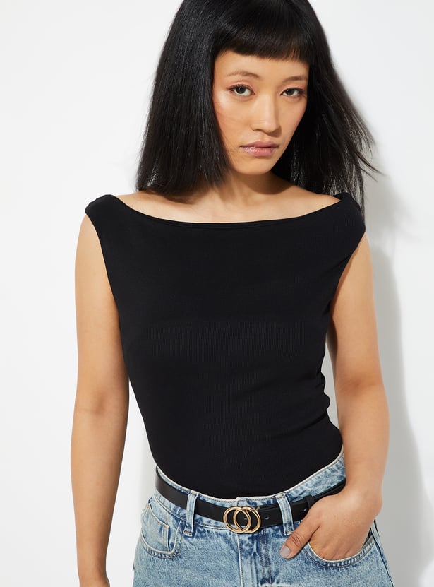 Sleek and modern, this ribbed off-shoulder top is designed with half sleeves for a balanced silhouette. The ribbed texture adds subtle detail, while the off-shoulder neckline brings a touch of effortless elegance