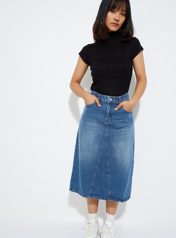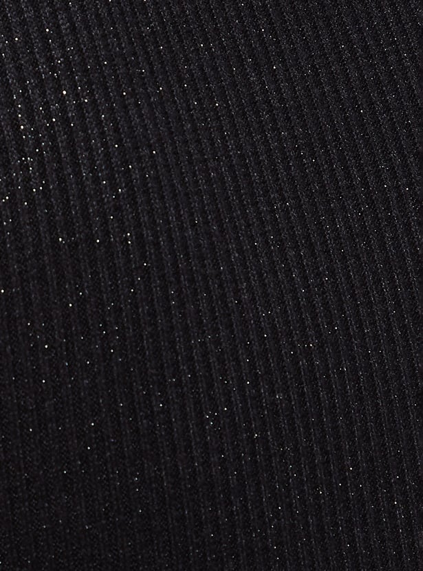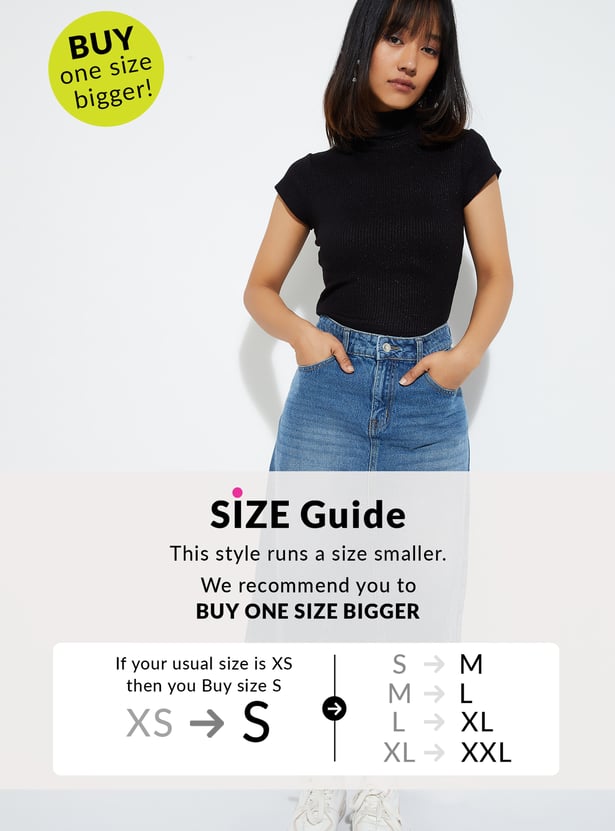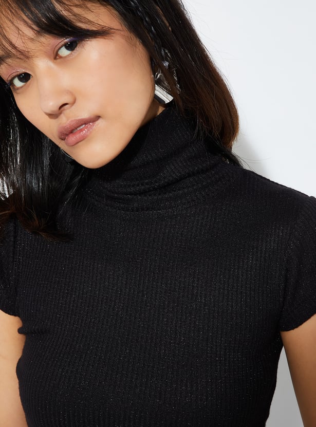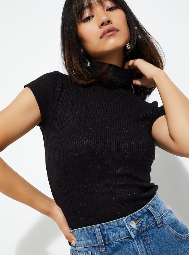 Shine bright in this ribbed T-shirt with a shimmer design. Featuring a chic turtle neck and half sleeves, it's the perfect blend of casual vibes and standout style.