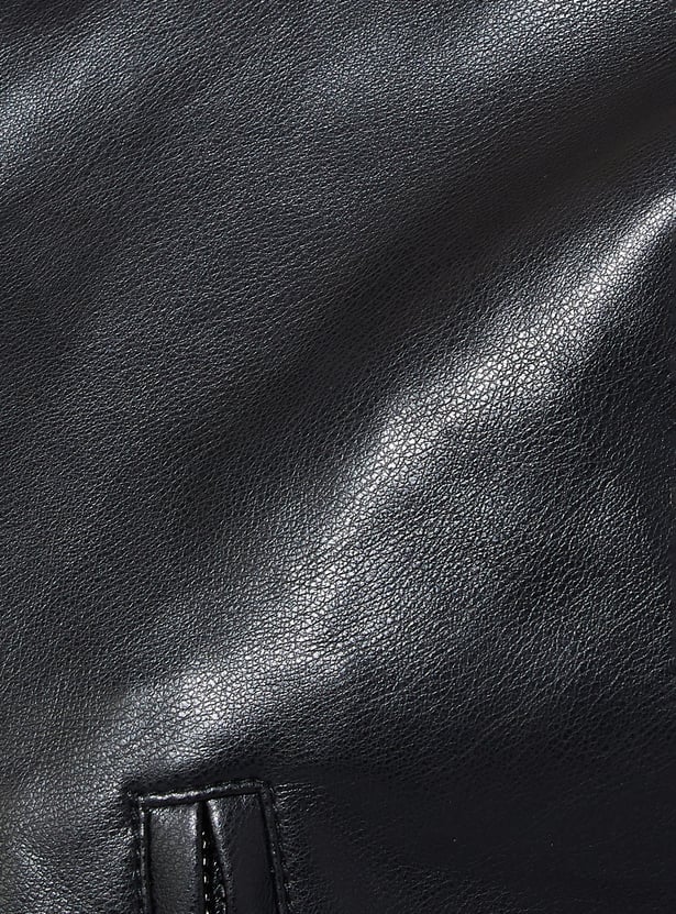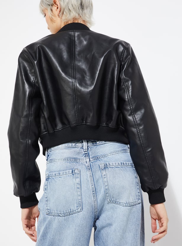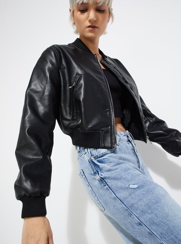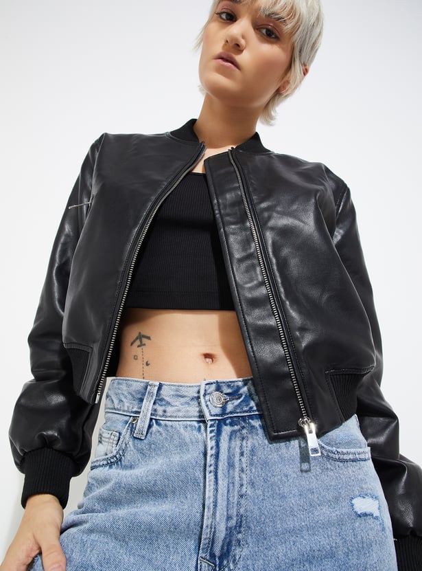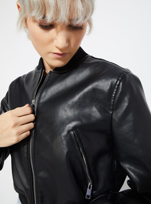 Amp up your edge with this solid biker jacket. Featuring a sleek zip closure, full sleeves, zip pockets, and a sporty baseball collar, it’s the perfect blend of classic biker aesthetics and modern casual flair.