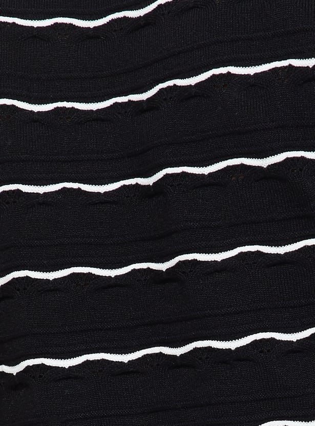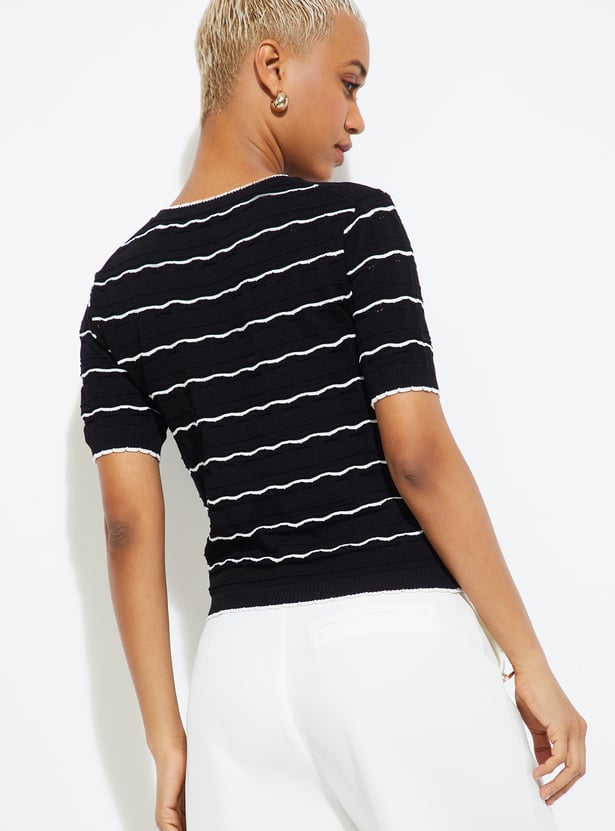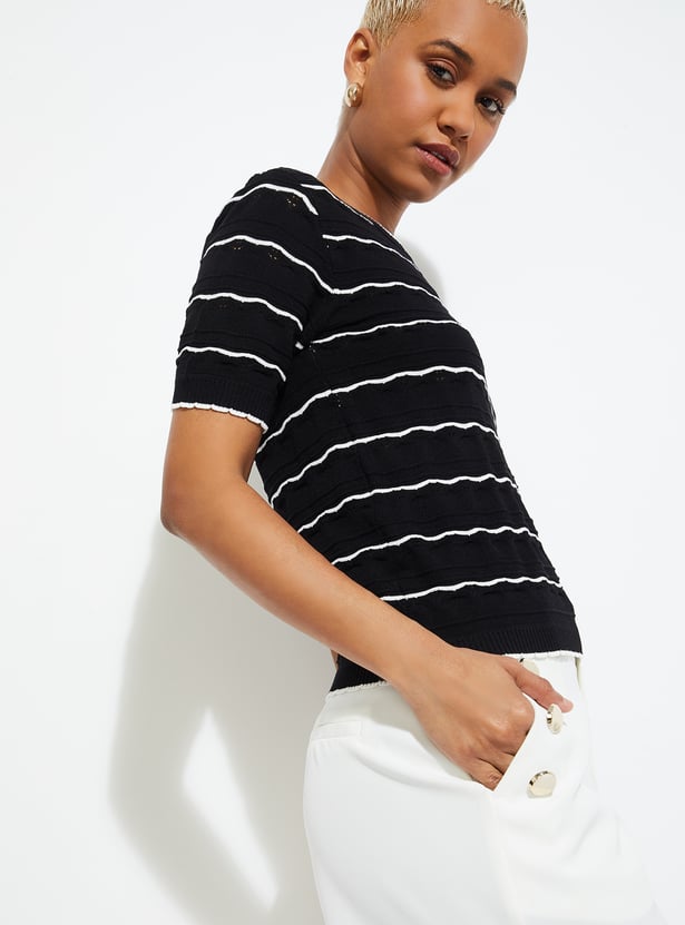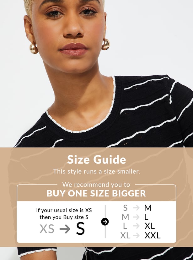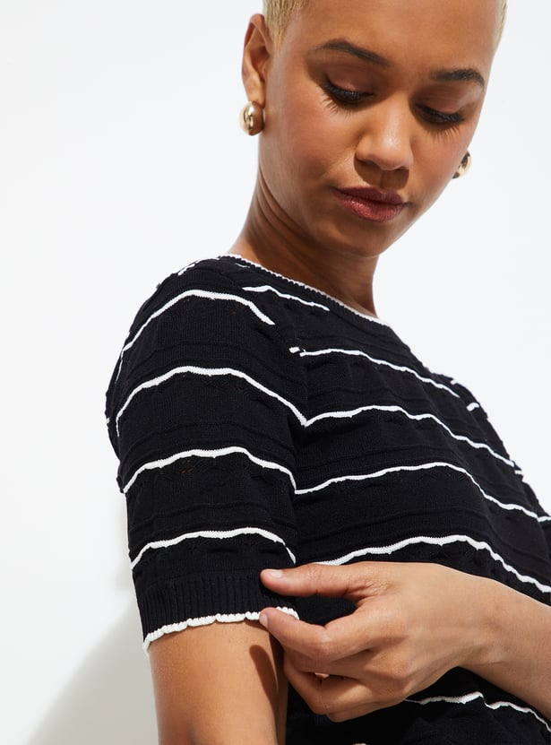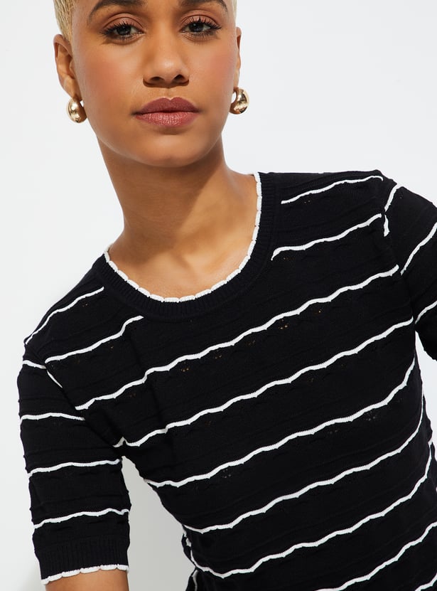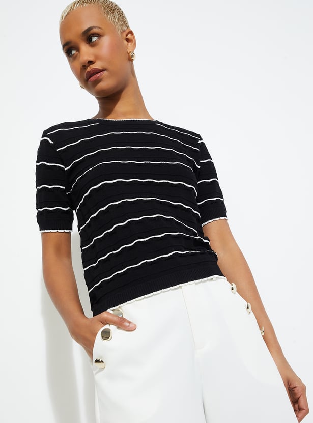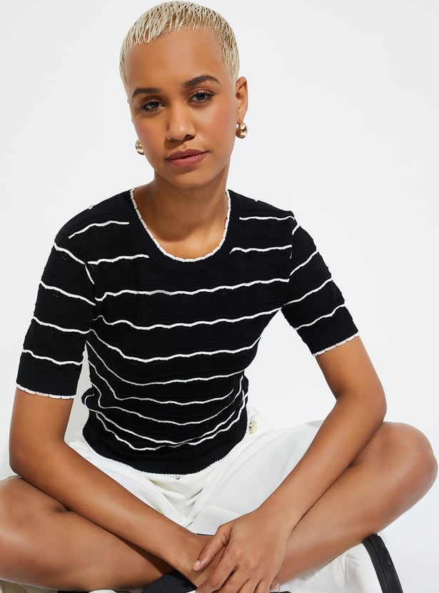 This striped T-shirt features a classic round neckline and half sleeves, offering timeless appeal with everyday comfort. The clean silhouette and easy stripes make it a versatile staple for casual styling.