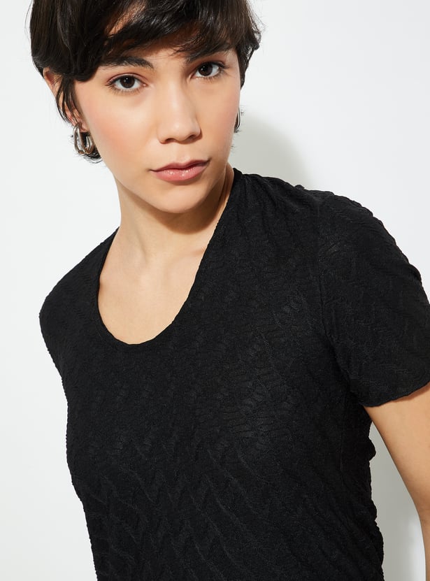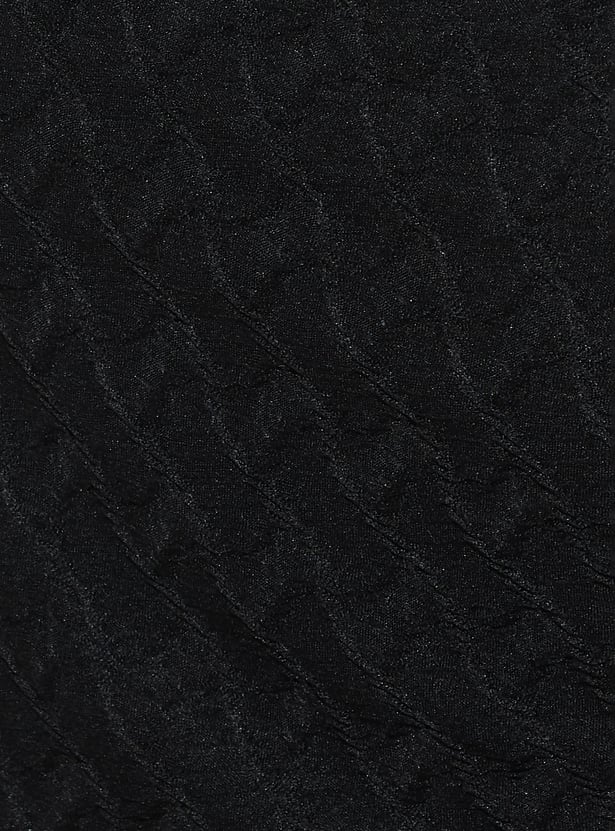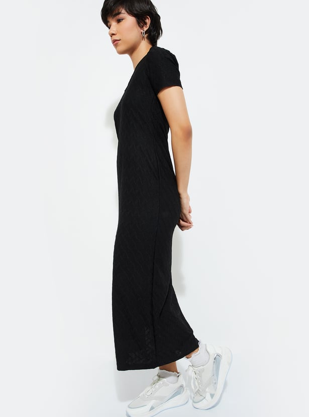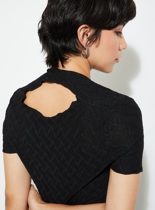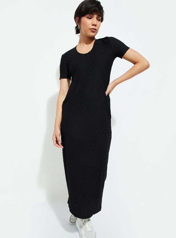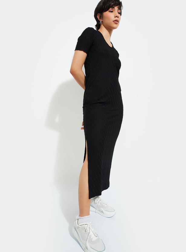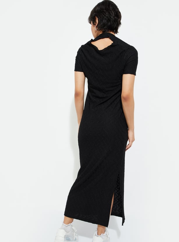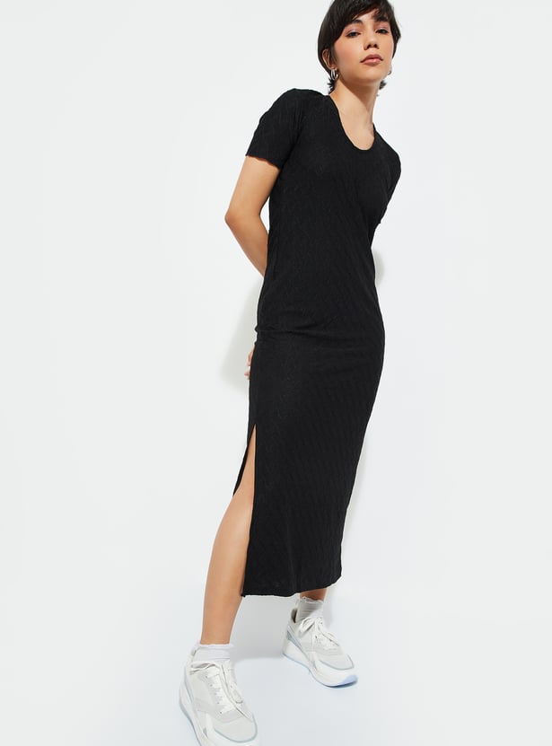 Level up your night-out game with this textured bodycon dress. With its flattering round neck and half sleeves, you’ll look effortlessly chic. The back cut-out adds a bold twist, while the side slit keeps things edgy and fun. Flowing down to a midi length, this dress is all about that sleek silhouette.