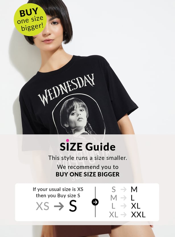 Make a bold statement with this Wednesday print oversized t-shirt—where comfort meets iconic attitude. Designed with a round neck and half sleeves, it offers a relaxed fit that’s perfect for laid-back, expressive styling. Model Size :
