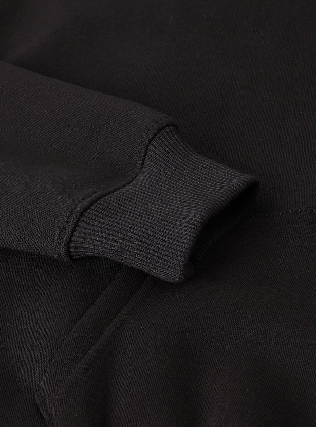 Update his cosy wardrobe with this sweatshirt. The graphic print on the chest and back gives a cute look. This sweatshirt features a hooded neck, full sleeves, and ribbed trim. The kangaroo pocket adds to the functionality.