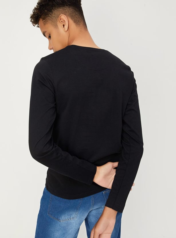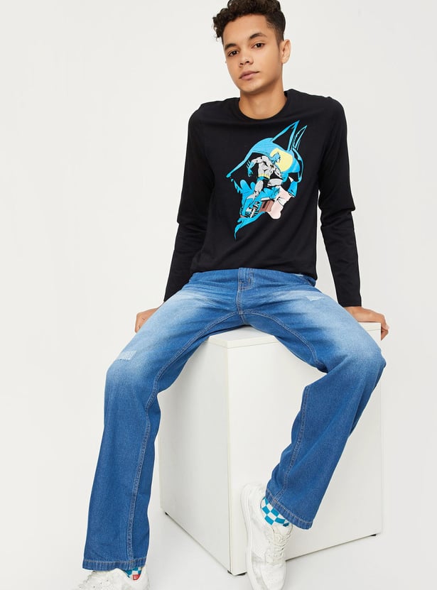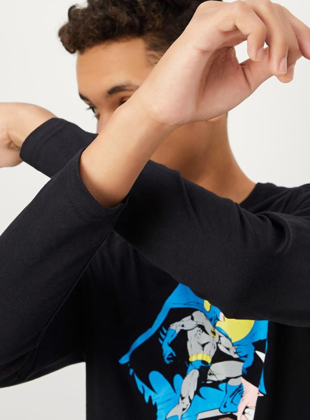 Add a fun twist to your kid's casual wardrobe with this T-shirt. It is styled with a Batman graphic print, a crew neck, and full sleeves. Style this tee with jeans and sneakers to nail the look.