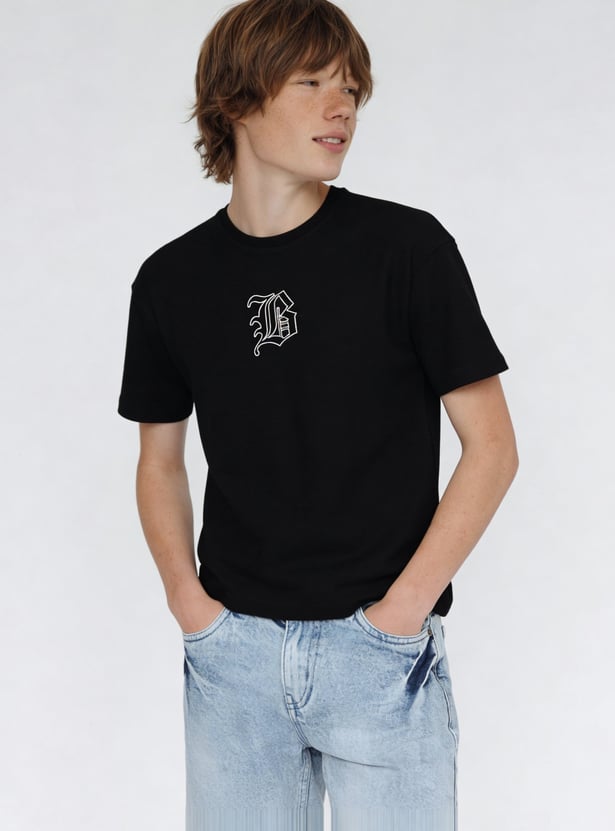 Edgy and oversized, this embroidered t-shirt features a crew neck, half sleeves. The intricate text embroidery adds a touch of elegance to the simple silhouette.