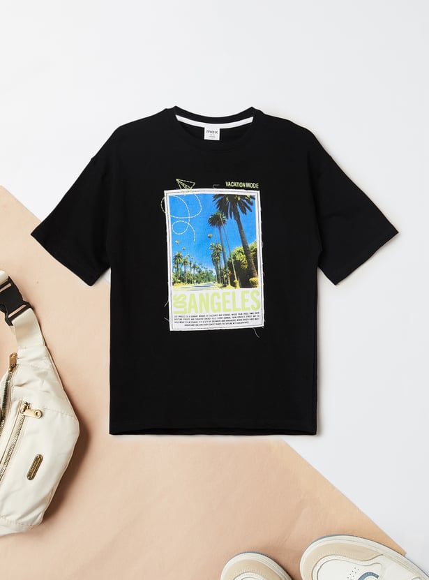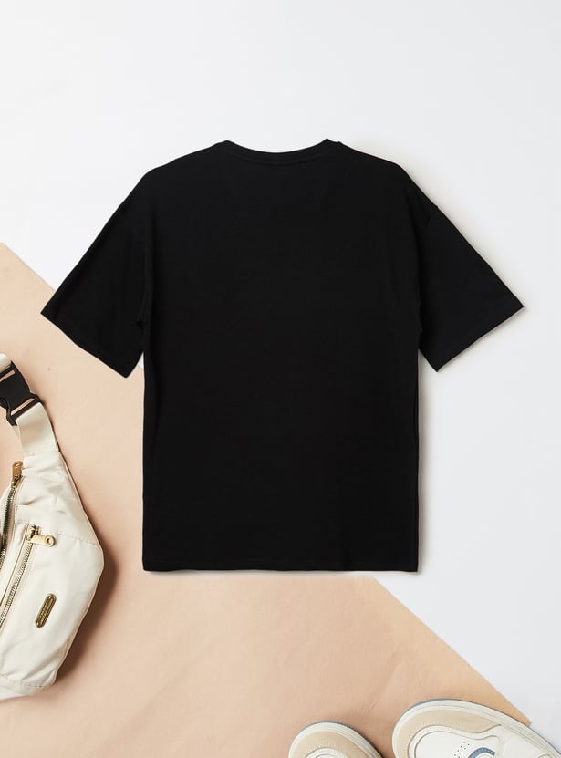 This printed T-shirt brings a fun twist to your casual wardrobe. Featuring a bold graphic print, a classic crew neck, and half sleeves, it offers an easy fit that’s perfect for everyday wear.